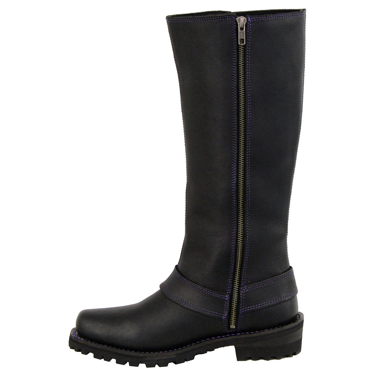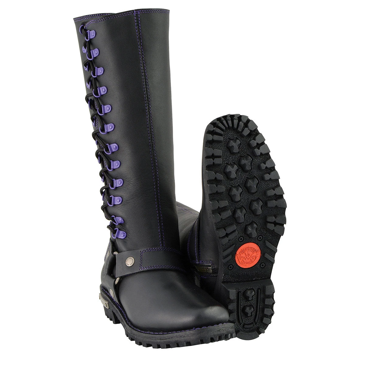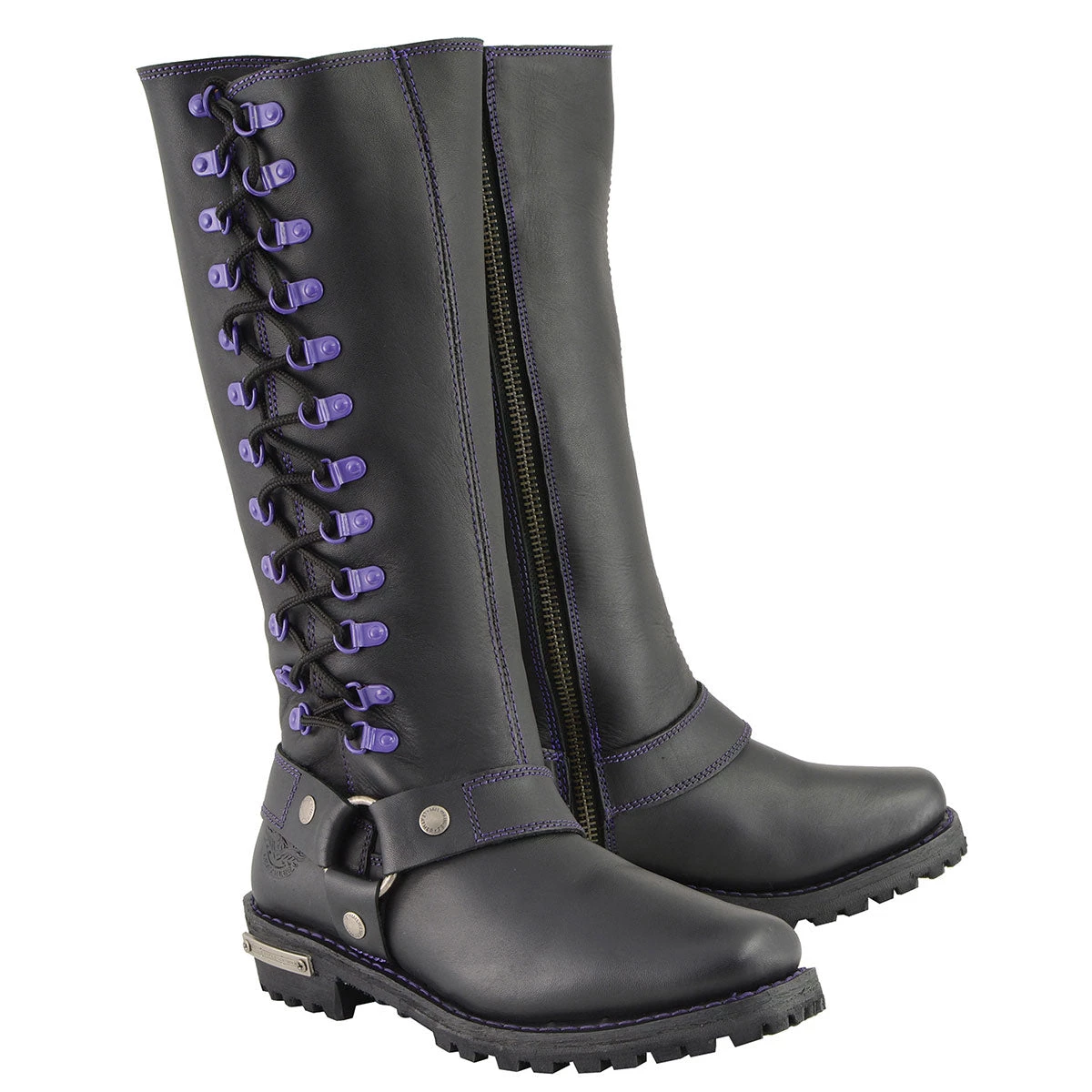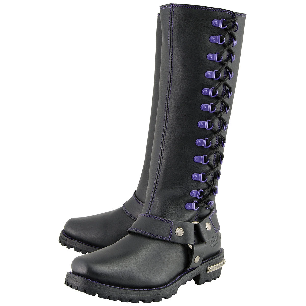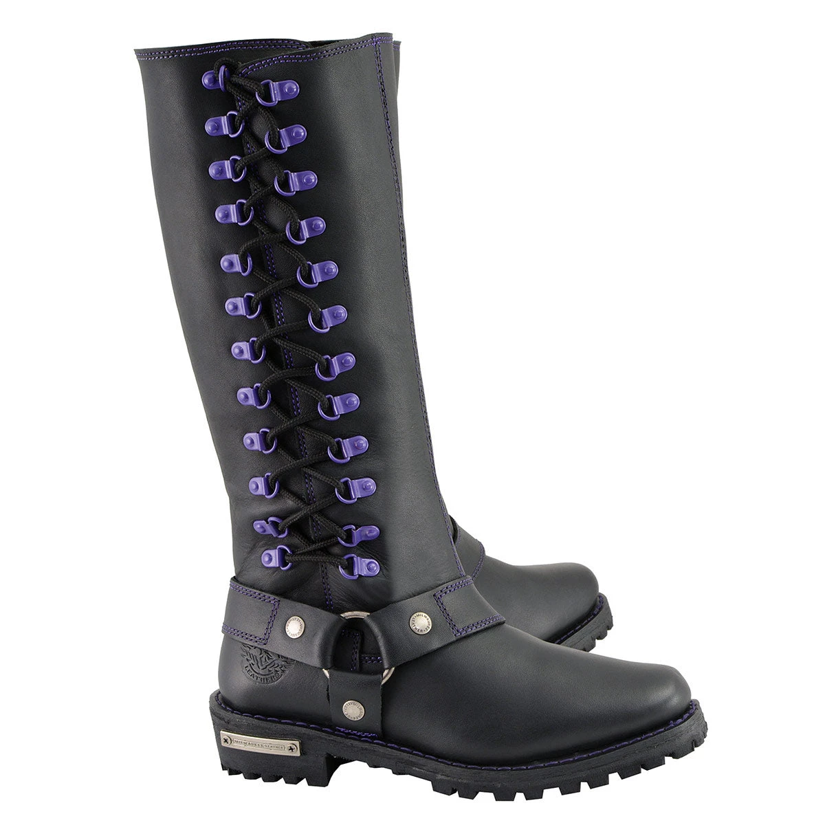 Milwaukee Leather MBL9366 Ladies Black 14-inch Leather Harness Boots with Purple Accent Lacing