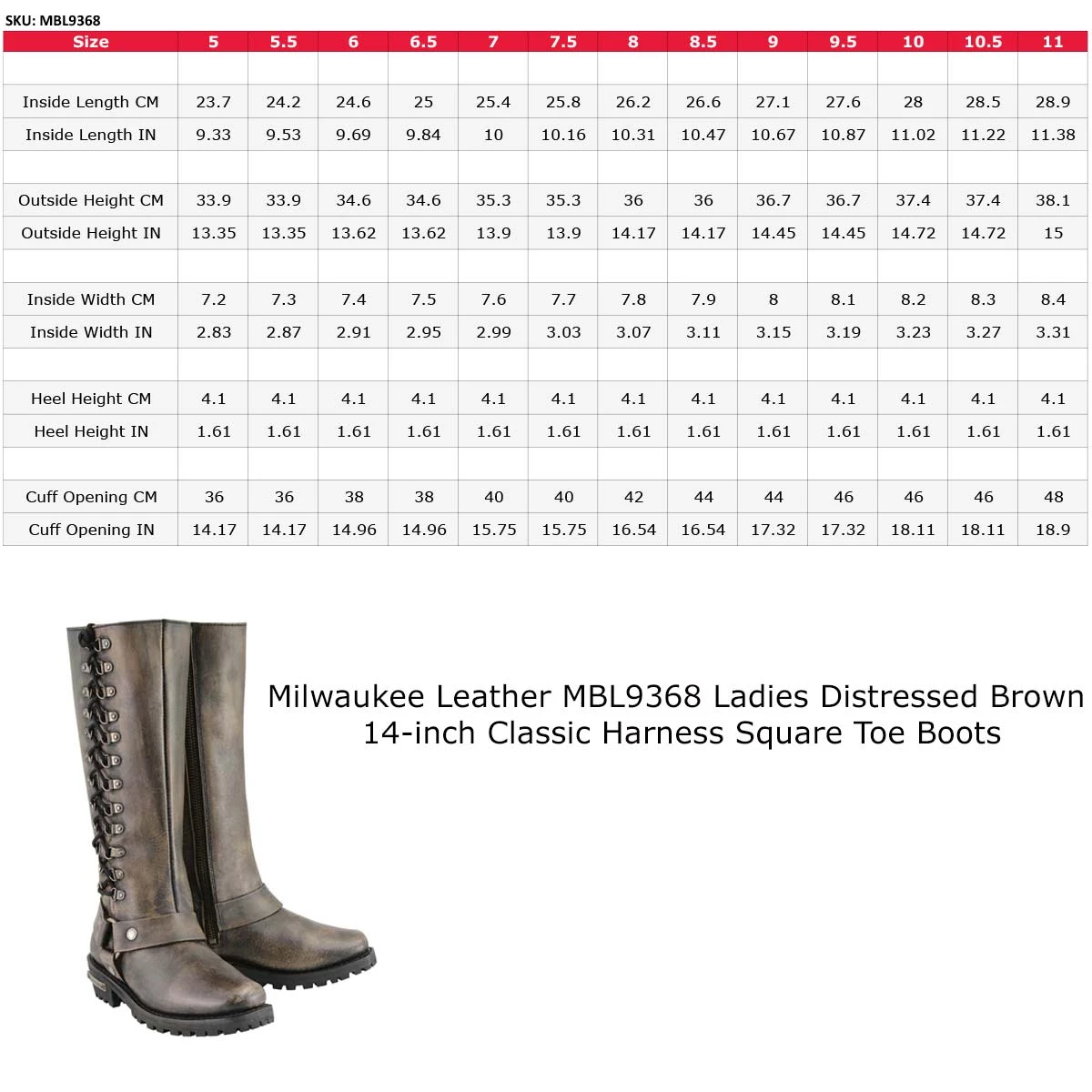 Milwaukee Leather MBL9368 Ladies Distressed Brown 14-inch Classic Harness Square Toe Boot with Lacing Detail