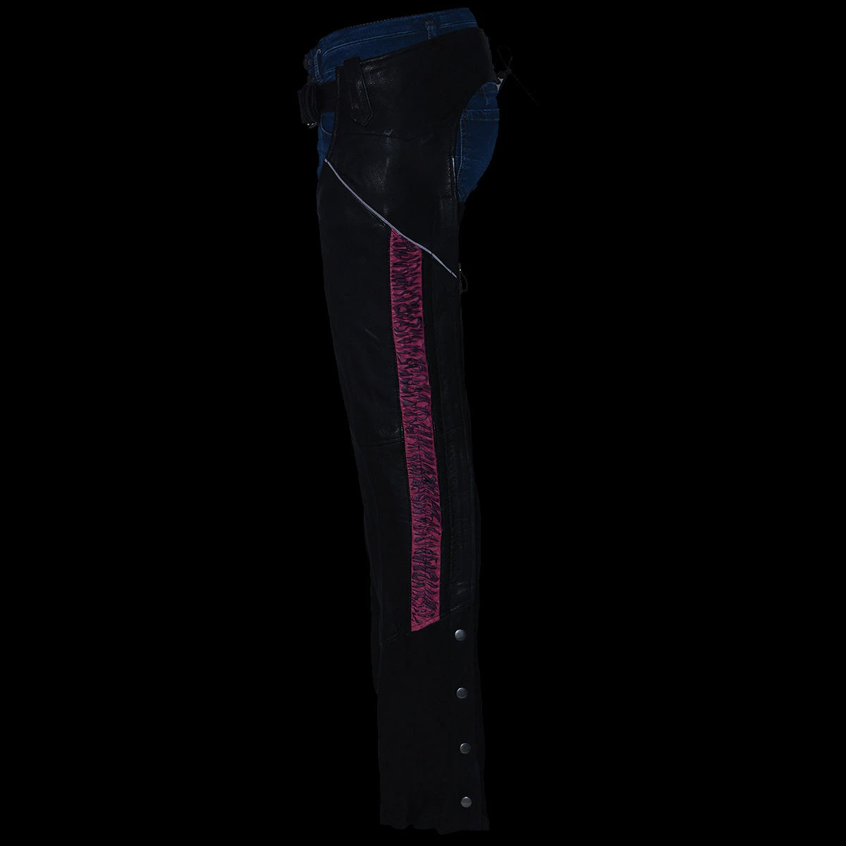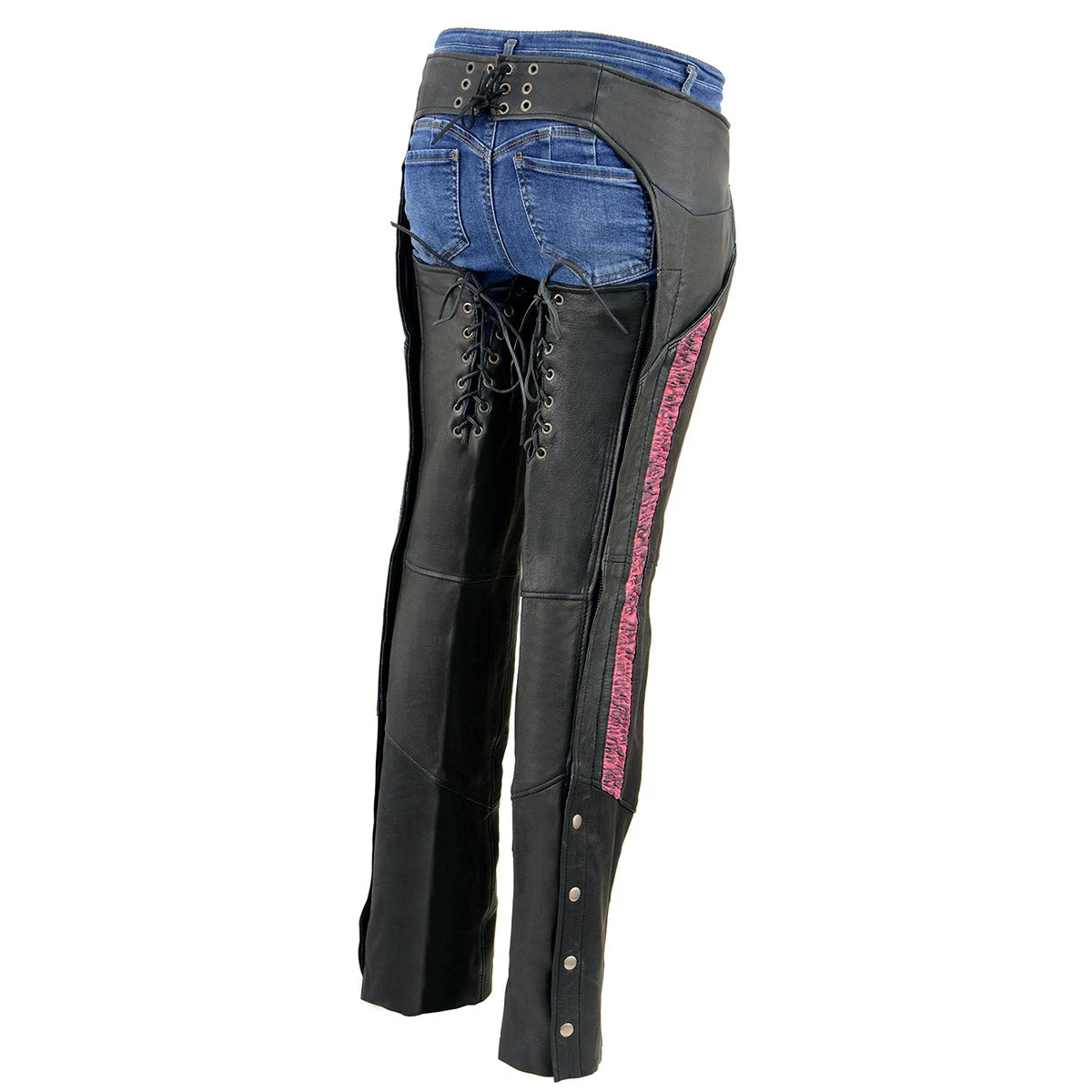 Milwaukee Leather MLL6501 Ladies Black and Pink Lightweight Low-Rise Chaps with Crinkled Leg Striping