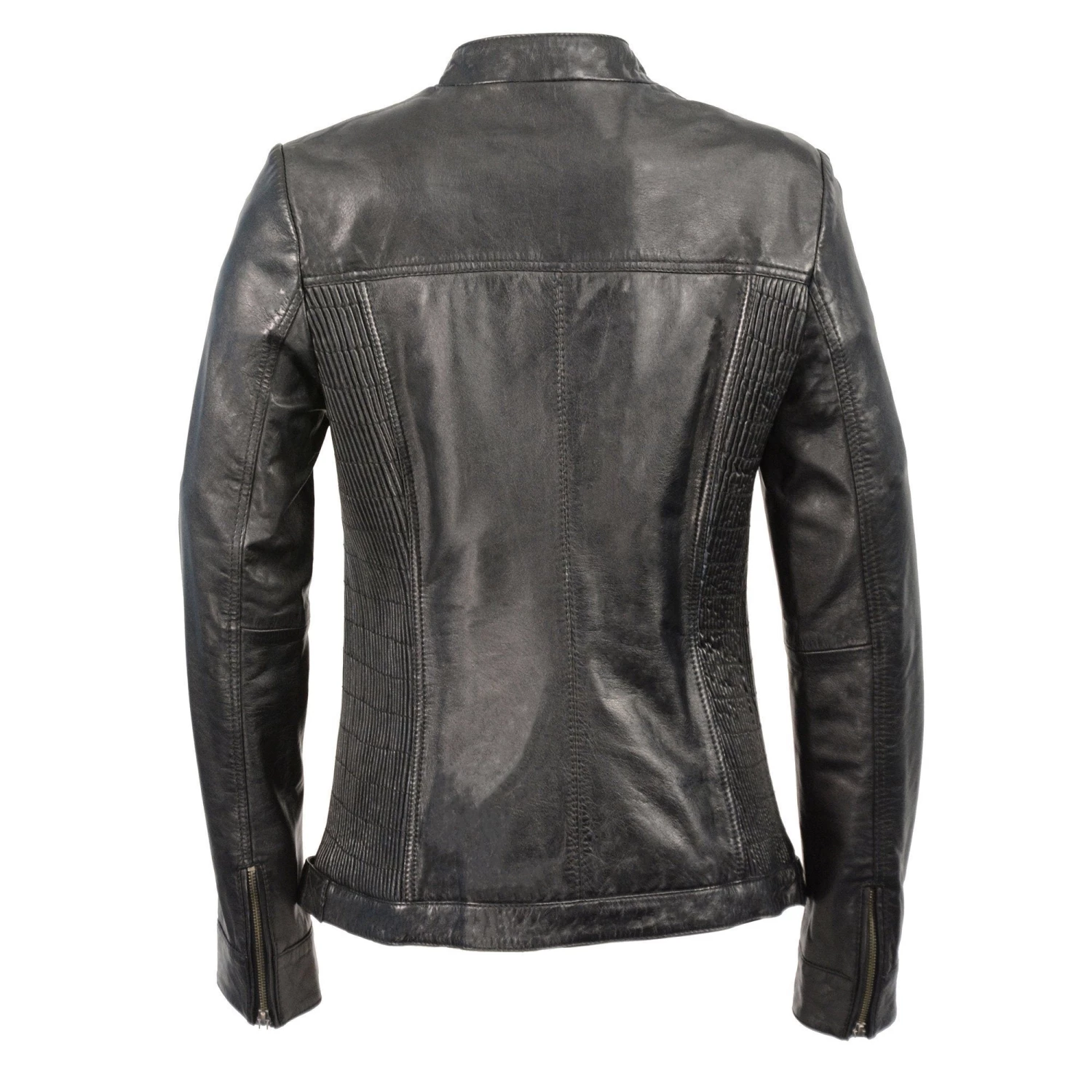 Enjoy a charming look with this women’s leather scuba jacket with a front zipper. Keep your hands warm with the two exterior zippered pockets, and store items in the two interior zippered drop pockets. Order yours today from LeatherUp, the most popular online motorcycle store.