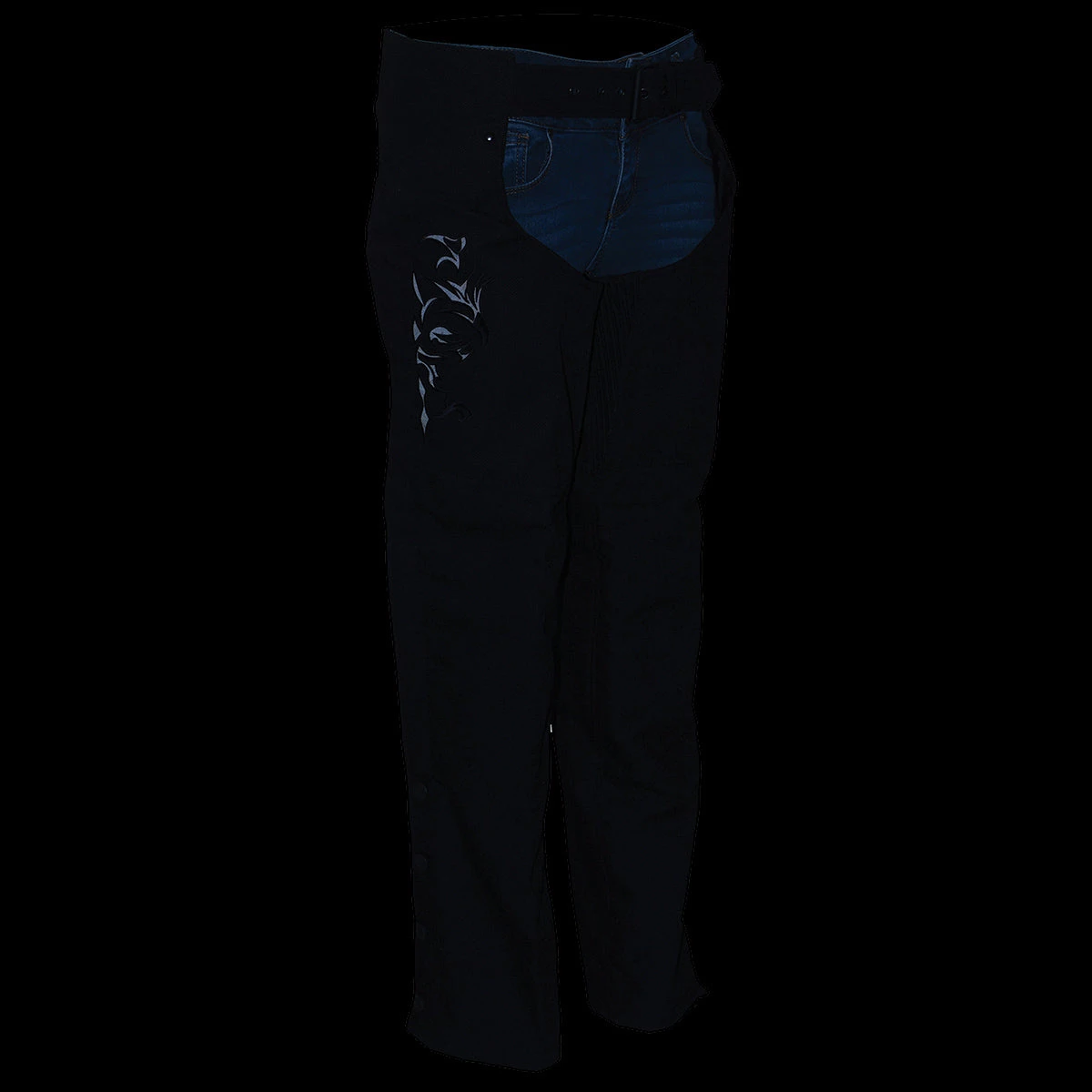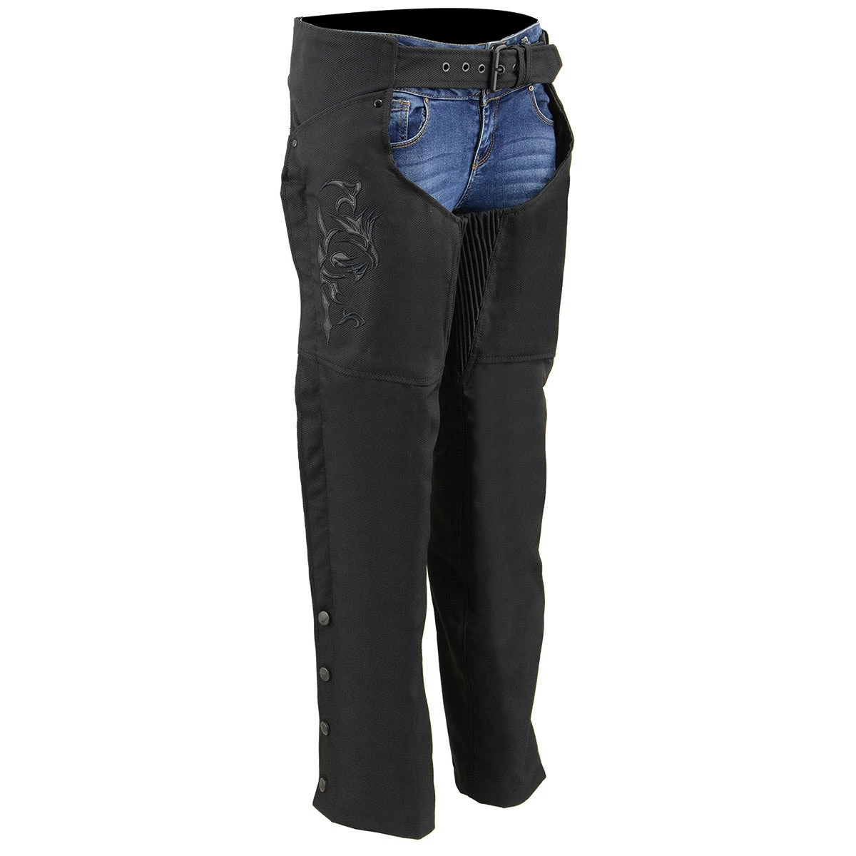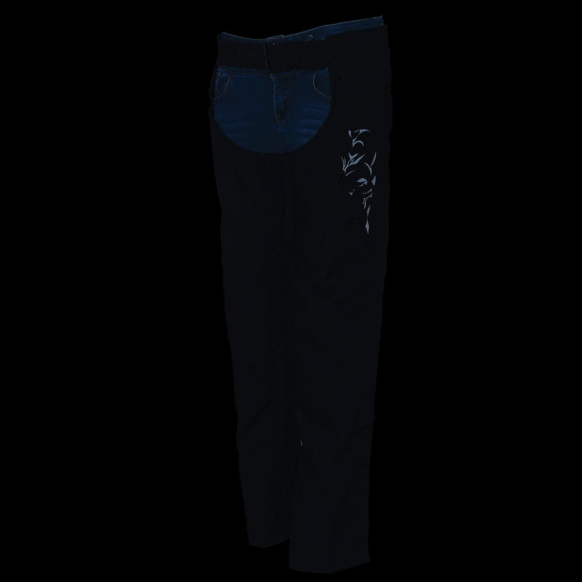 Milwaukee Leather SH1182 Women’s Black Textile Chap with Tribal Embroidery and Reflective Detail