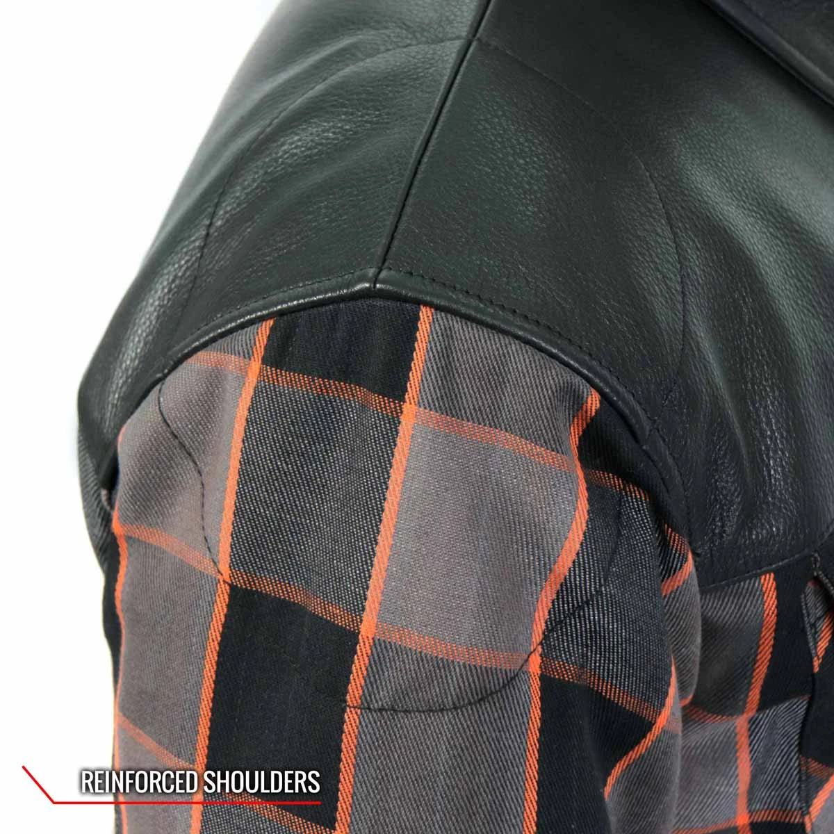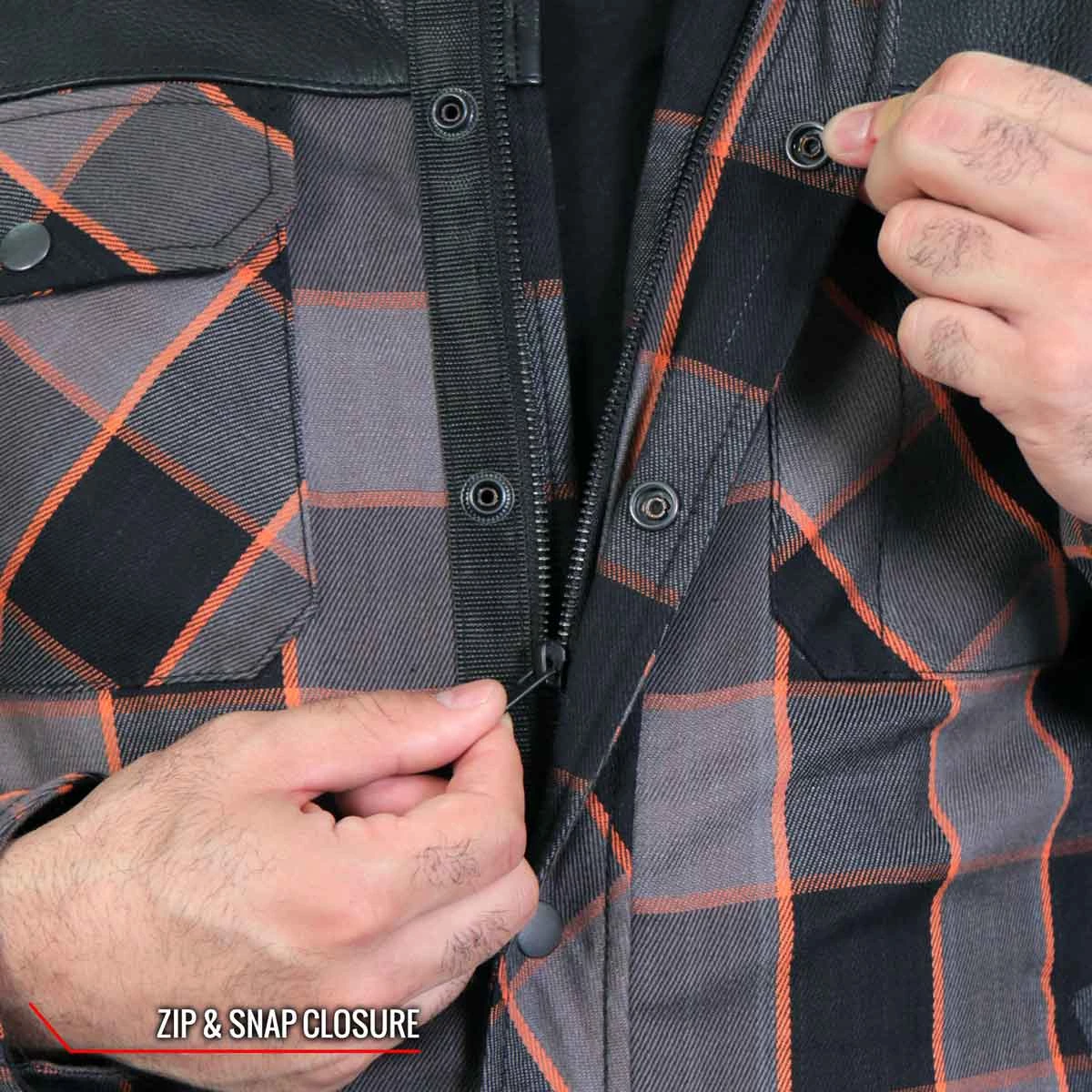 Hot Leathers JKM3202 Men’s Grey Black and Orange Kevlar Reinforced Leather and Plaid Flannel Shirt