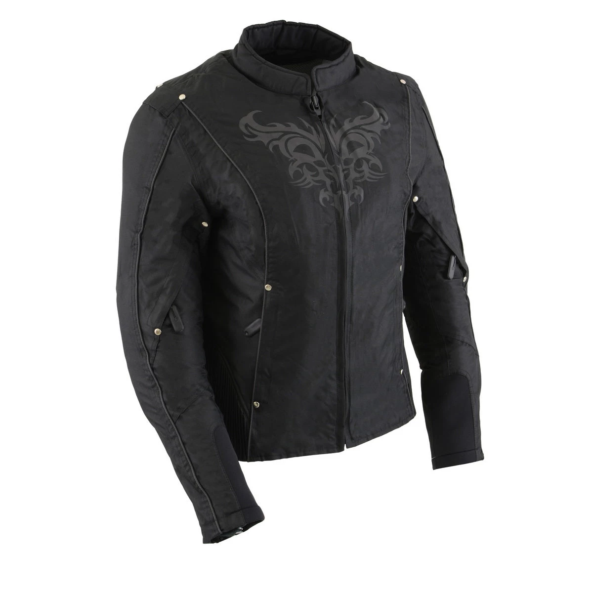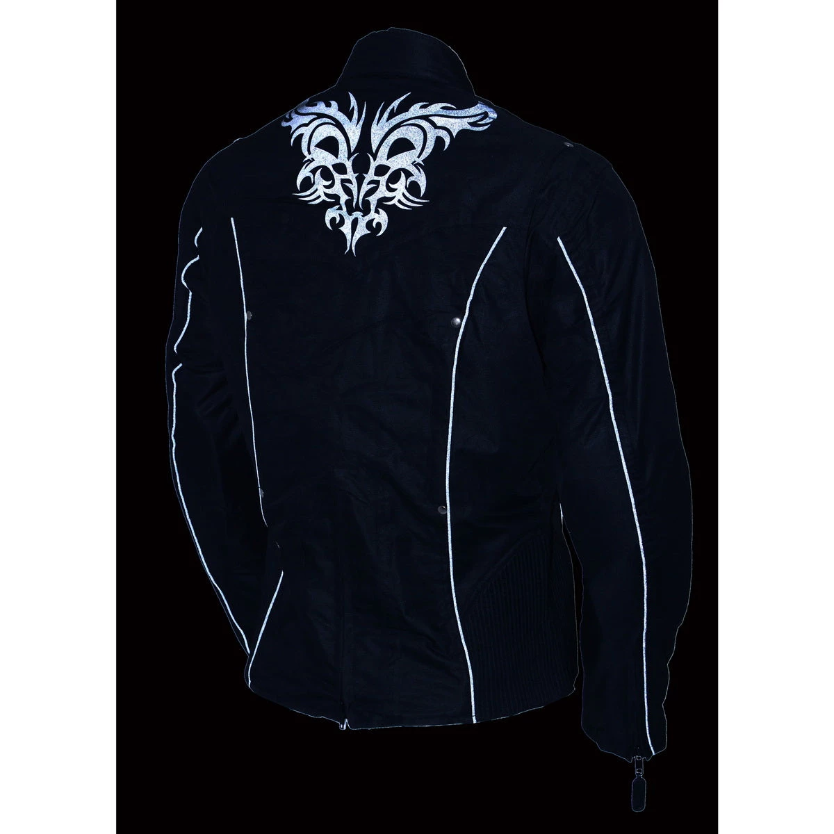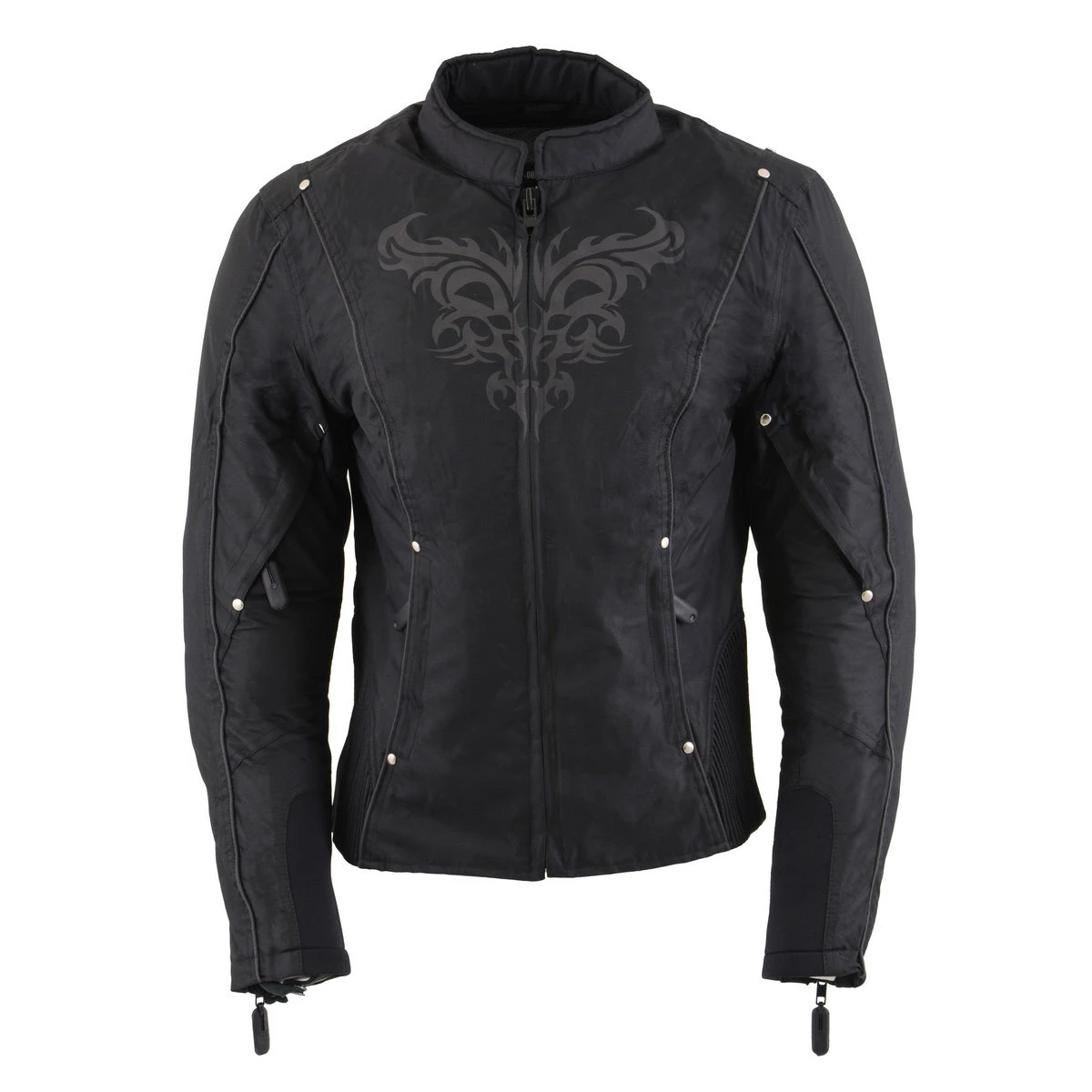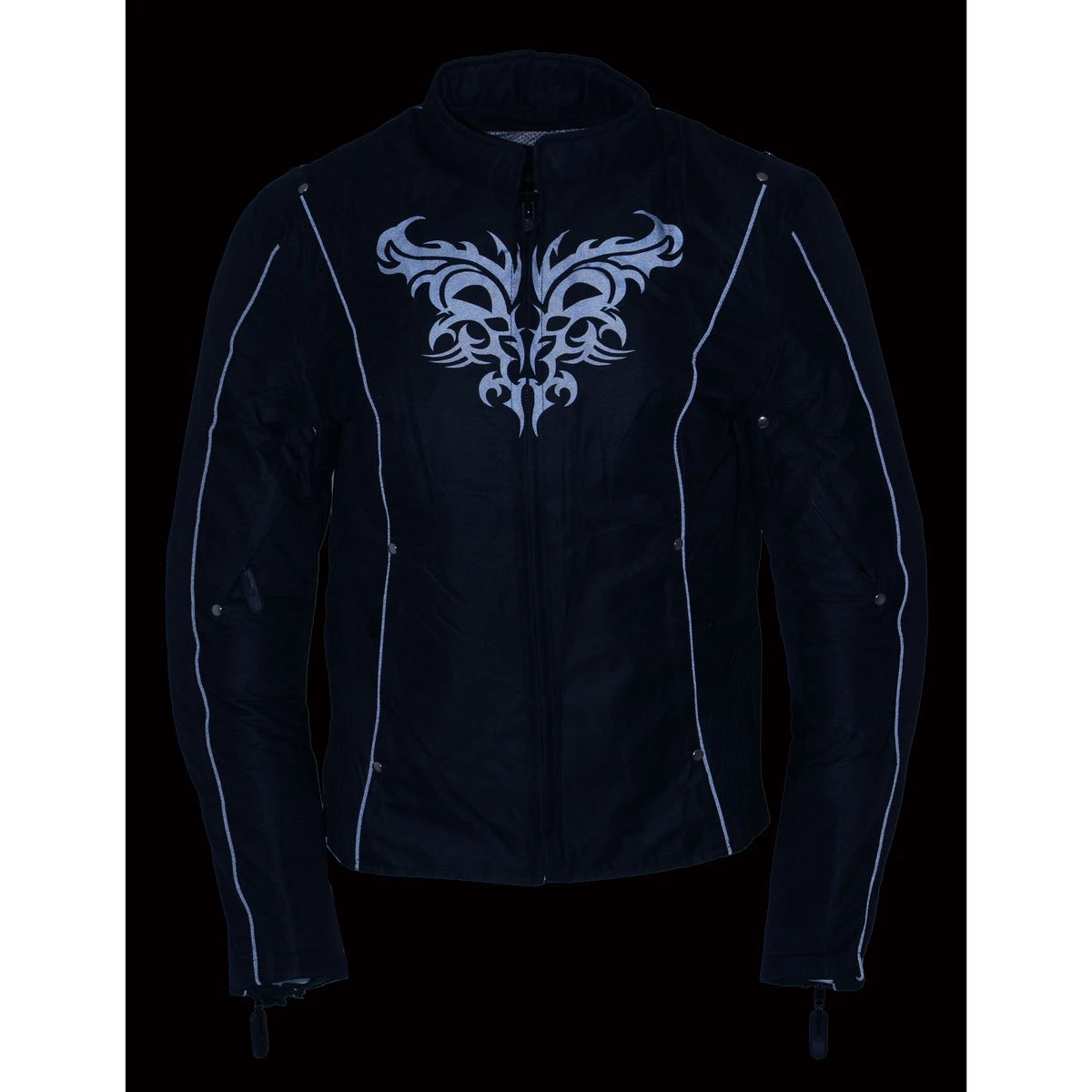 Milwaukee Leather SH2366 Ladies Black Armored Textile Jacket with Reflective Tribal Design