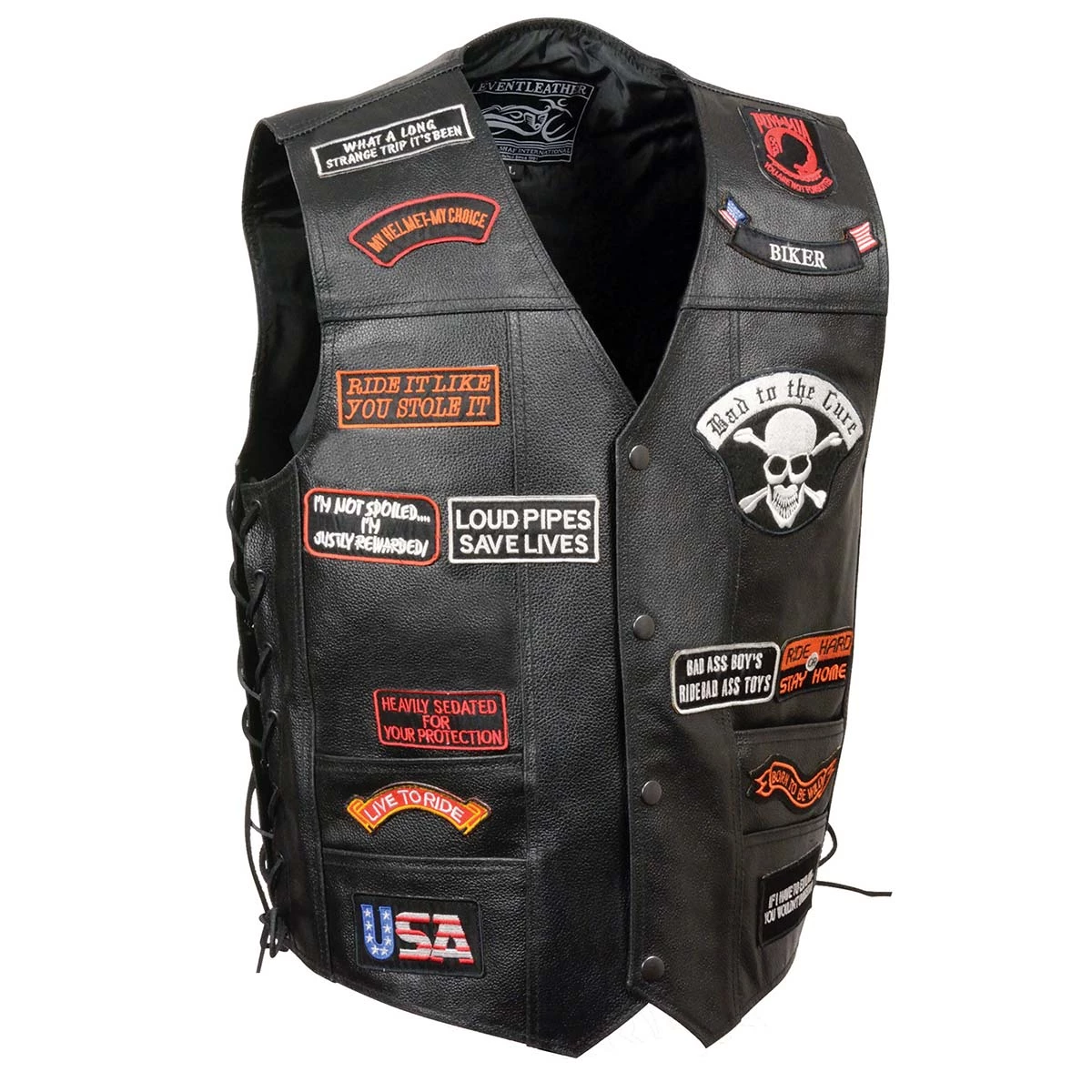 Event Leather ELM3920 Men’s Black Side Leather Vest with 23 Patches