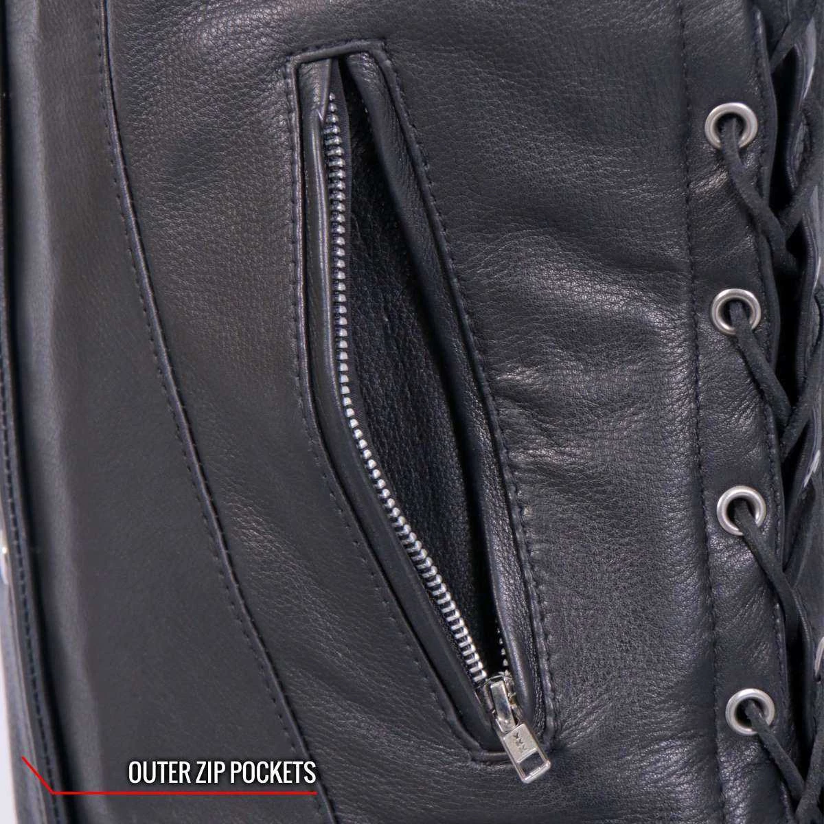 Front V-Neck and 4 Snap Front. It Has Front Zippered Convenience Pockets, Inner Extra Large Gun Pocket, and a Zippered Media Lipstick Pocket. The Lining is Hot Leathers Original Art. The Side Panels Offer Extra Room if Necessary, and are Tied with The Same Premium Naked Leather Laces. Best Quality Inside and Out on This Vest.