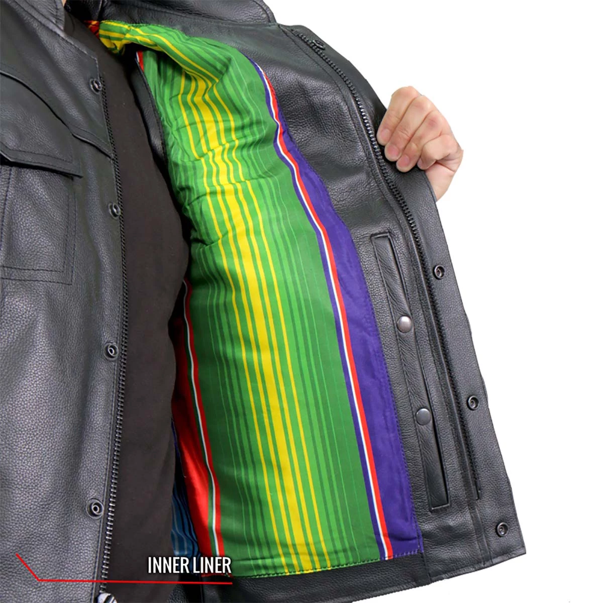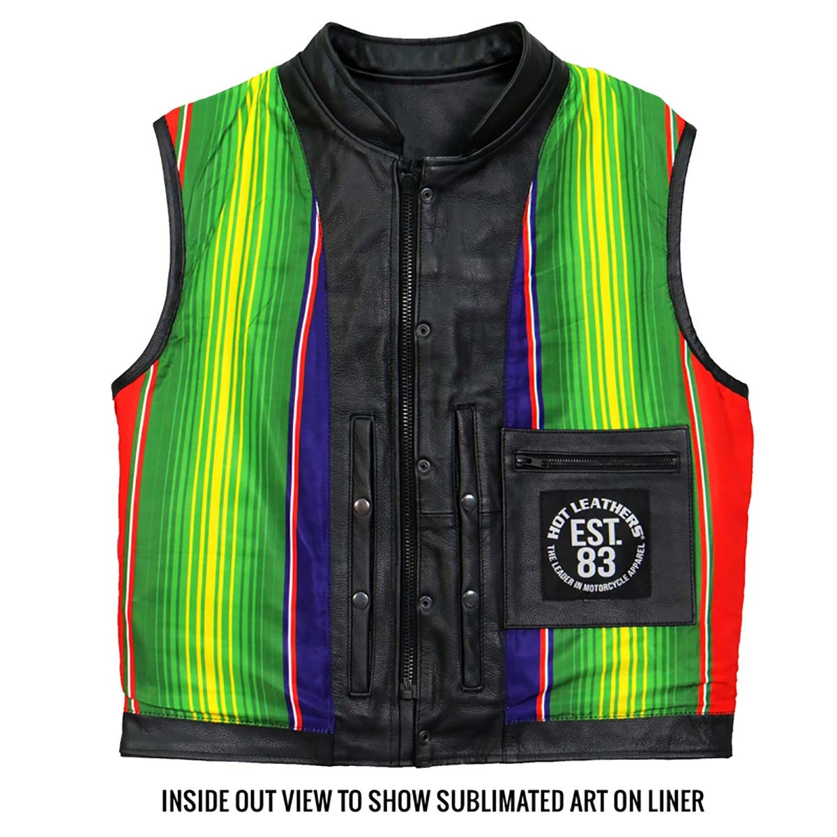 Hot Leathers Is Proud to Announce of New Collection of Leather Riding Vests with Full Graphic Printed Lining. This Hot Leathers Motorcycle Club Style Vest Is Built Using Heavyweight Cowhide, Has A Full Zippered Front and Black YKK Hidden Snaps. This Vest Features a Multi Color Polyester Printed Lining Using the Art from Our Classic Mexican Blanket Design. This Vest Features Four Outside Pockets, Two Carry Conceal Pockets and One Zippered Media Pocket. 7 Pockets! It Features A One Piece Back with No Seams Which Is Great for Stitching Large Patches On.