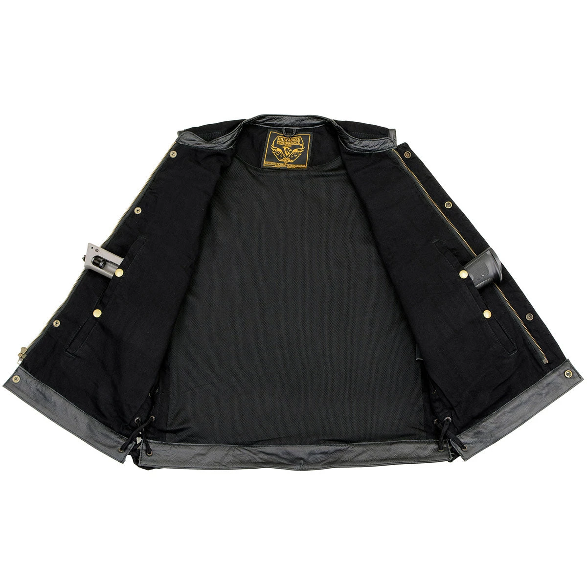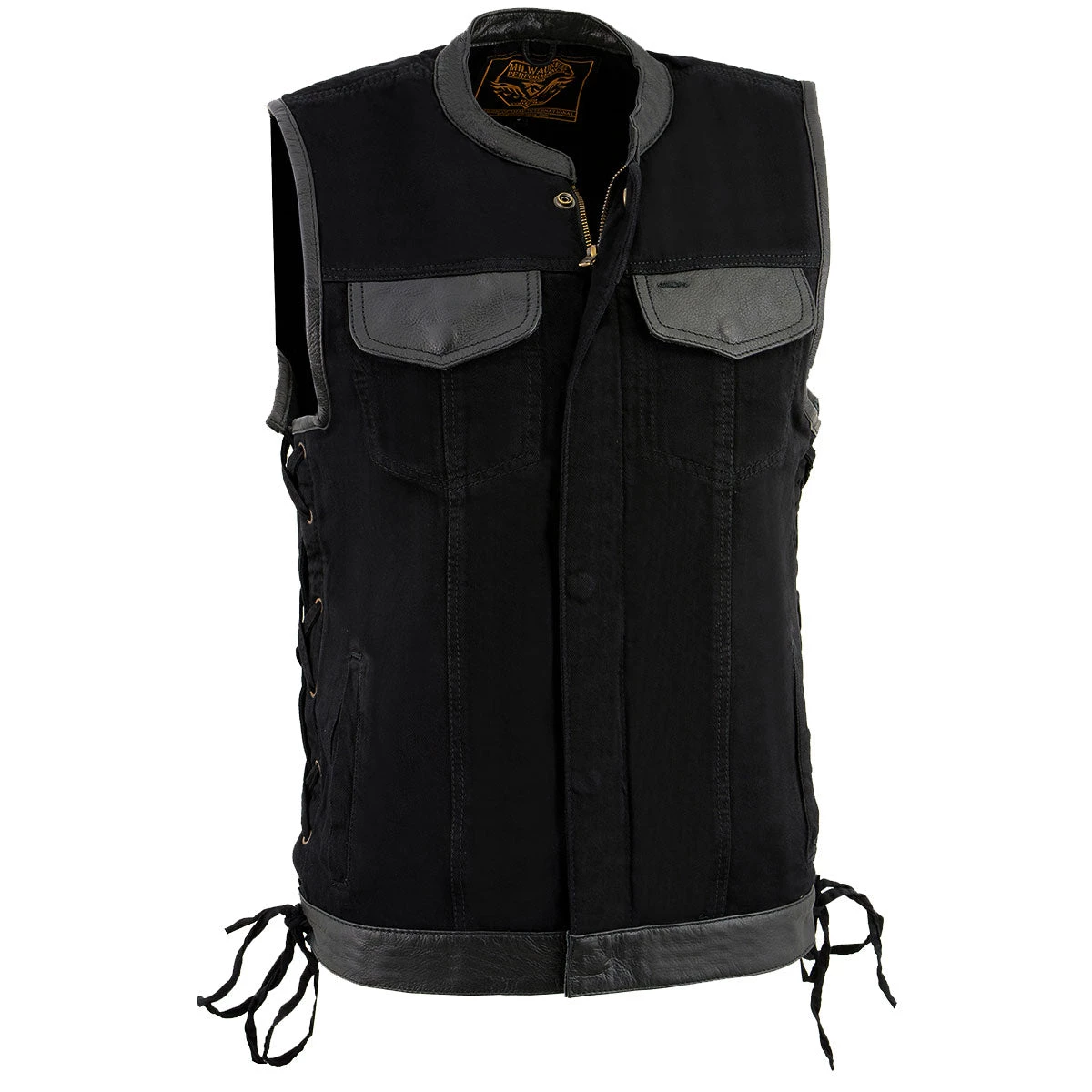 Milwaukee Leather MDM3011 Men’s Black Side Lace Denim Vest with Leather Trim and Hidden Zipper