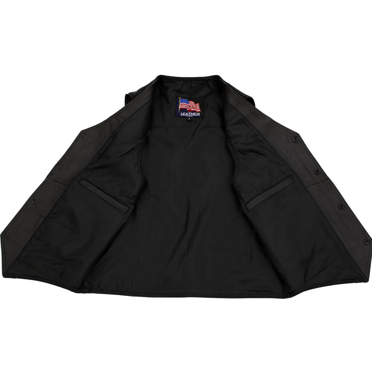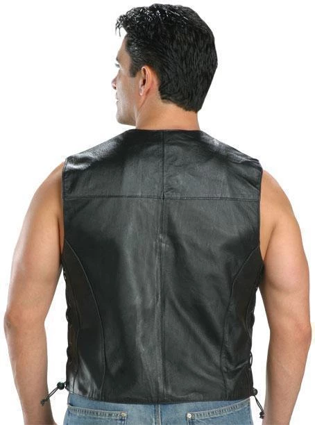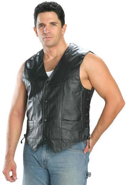 USA Leather Classic Men’s Leather Vest Featuring a Four-Button Snap Closure with Two Side Pockets, Adjustable Laces for Added Fit and Comfort. Classic Design and Fit. Only Found Here, At Leatherup. Buy Direct from Manufacturer And Save