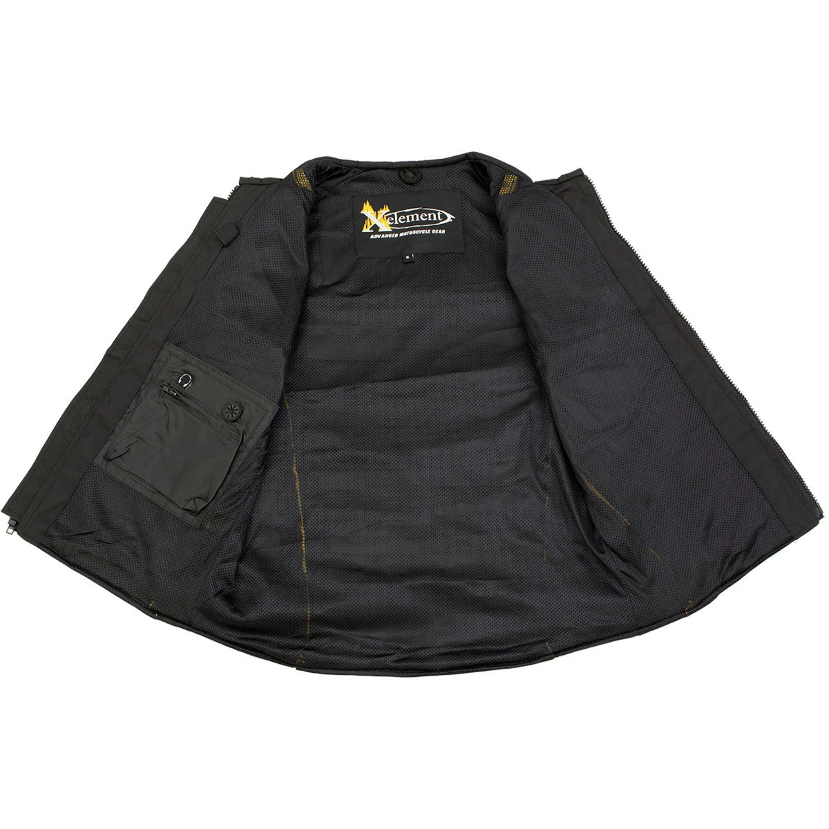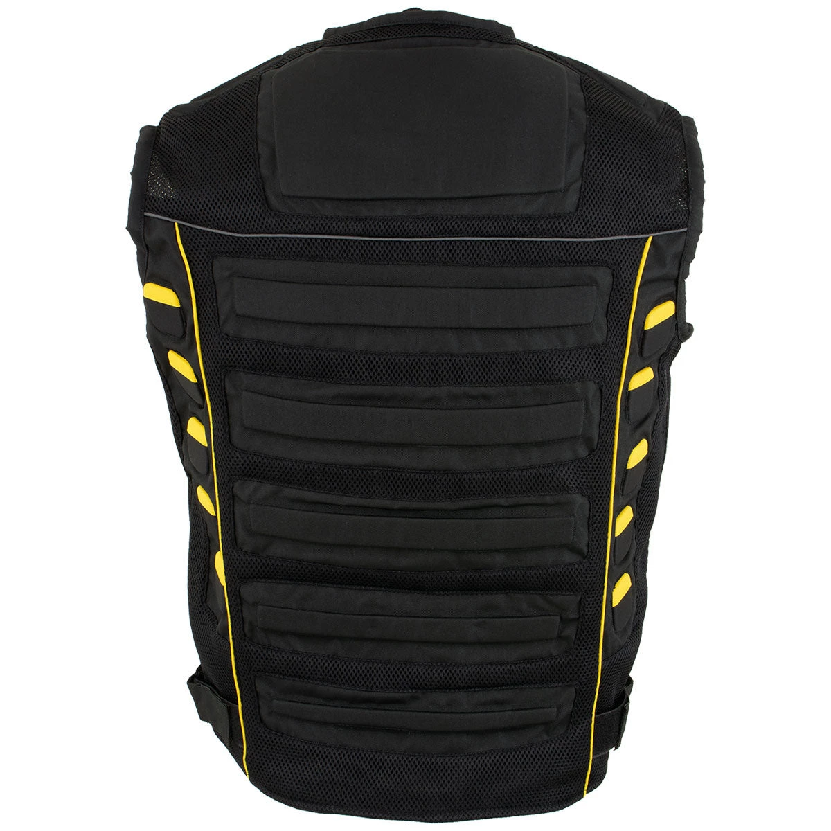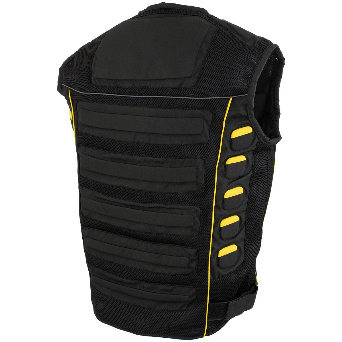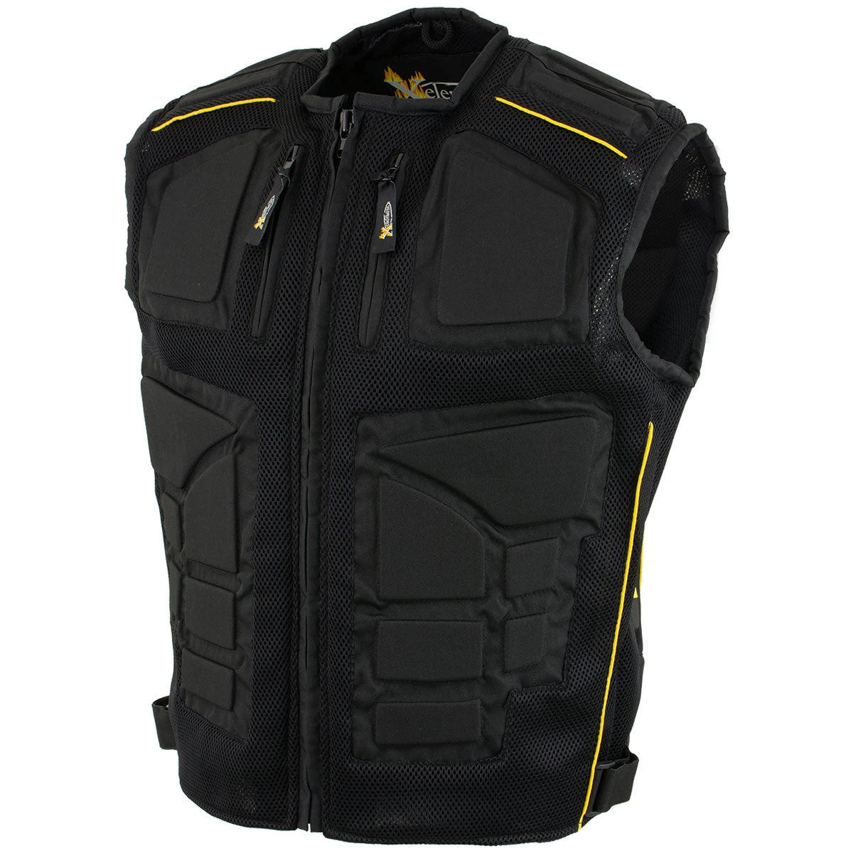 Turn Some Heads and Look Extra Cool with The Most Unique Vest on The Market, The Xelement ‘Delta’ CF244 Black Padded Tri-Tex Fabric and Mesh Vest. Constructed From 600 Denier High Performance Breathable Waterproof and Laminated Tri-Tex Fabric and Mesh. Black Color with A Yellow Outline. Features A Padded Front and Back, Adjustable Hook and Loop Straps on The Sides and Two Outside Chest Zipper Pockets. This One Of A Kind Vest Is Only Available At Leatherup, The Web’s Most Popular Online Motorcycle Store.