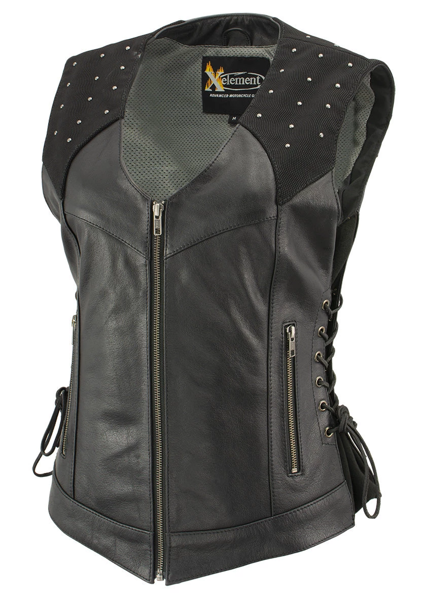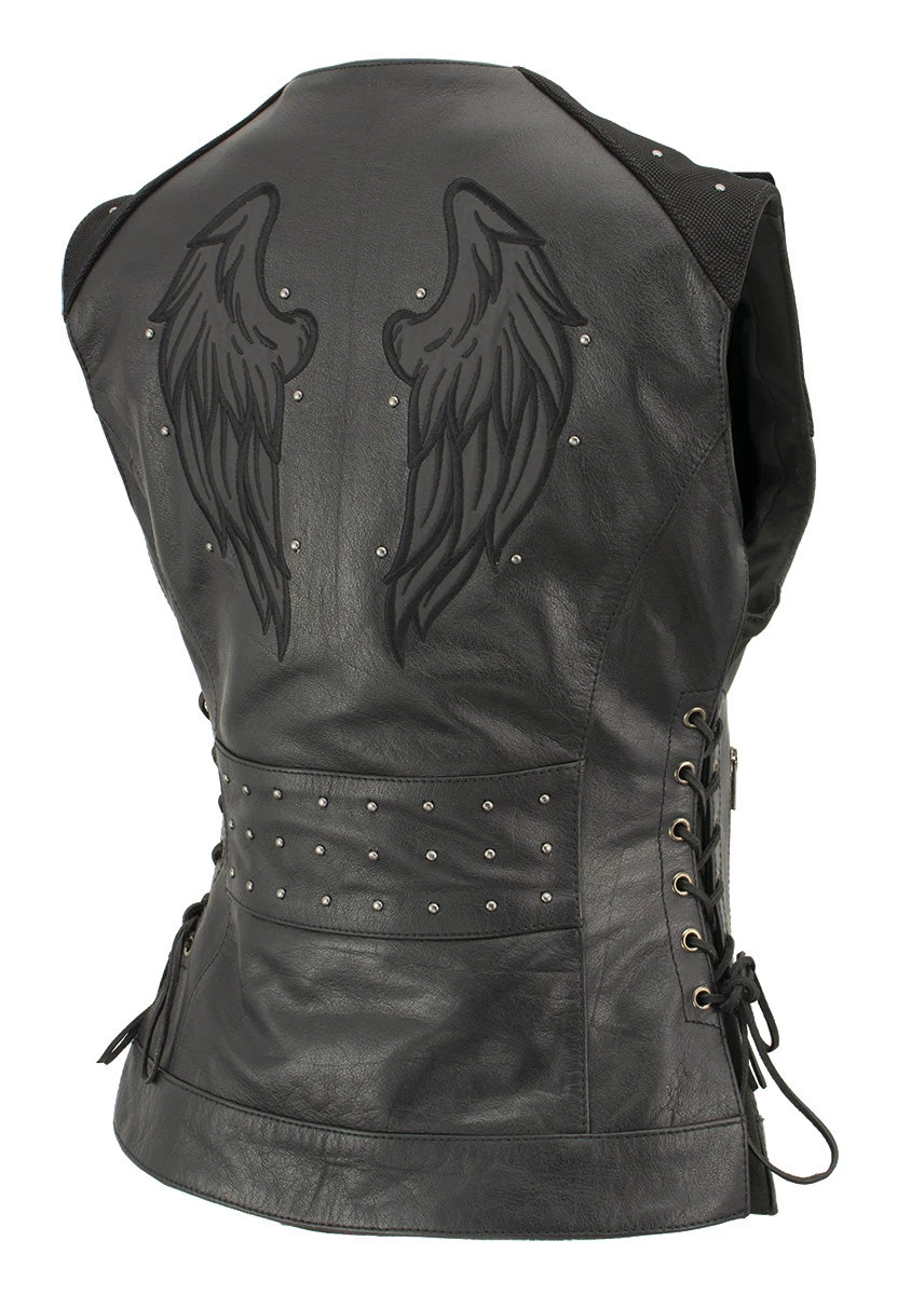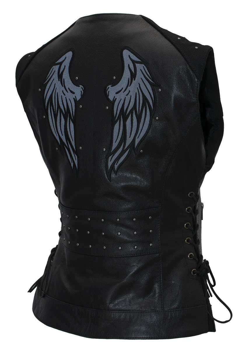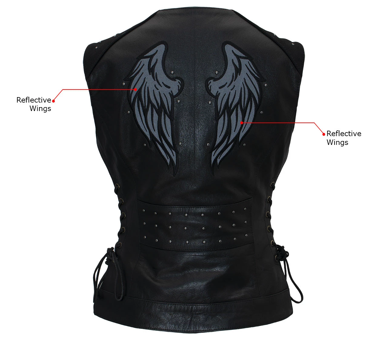 Xelement XS24001 Ladies ‘Winged’ Black Studded Leather Vest with Side Laces and Reflective Wings
