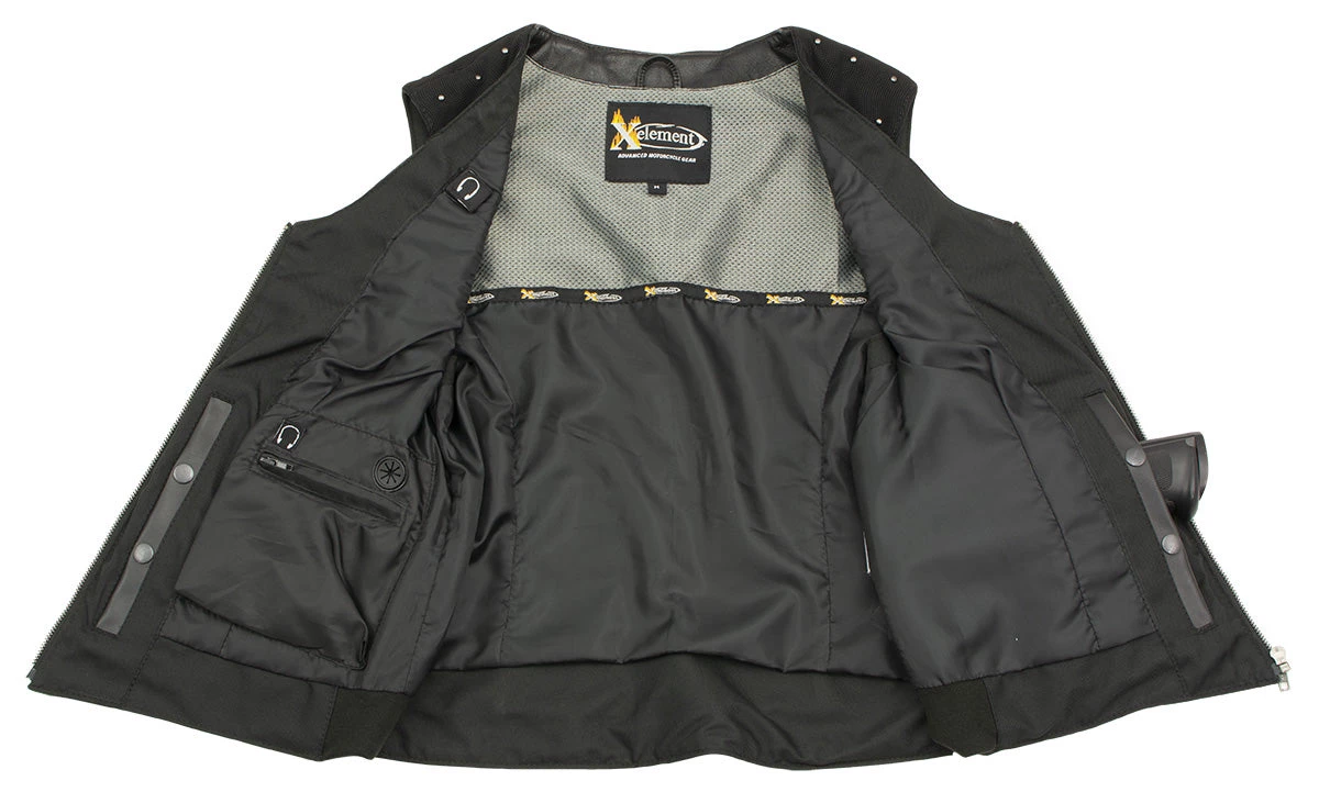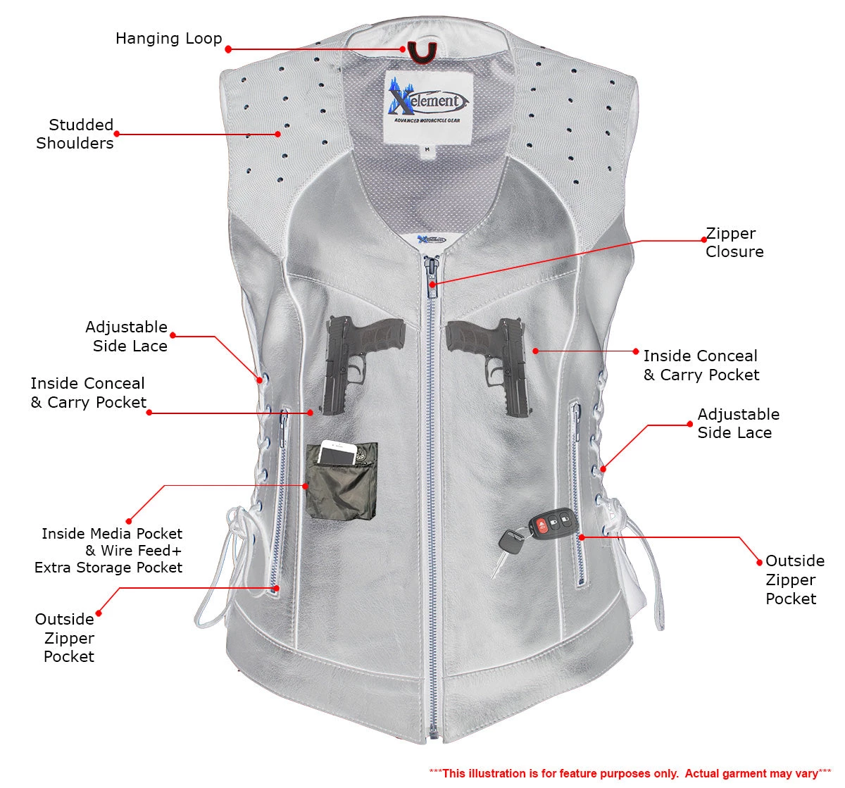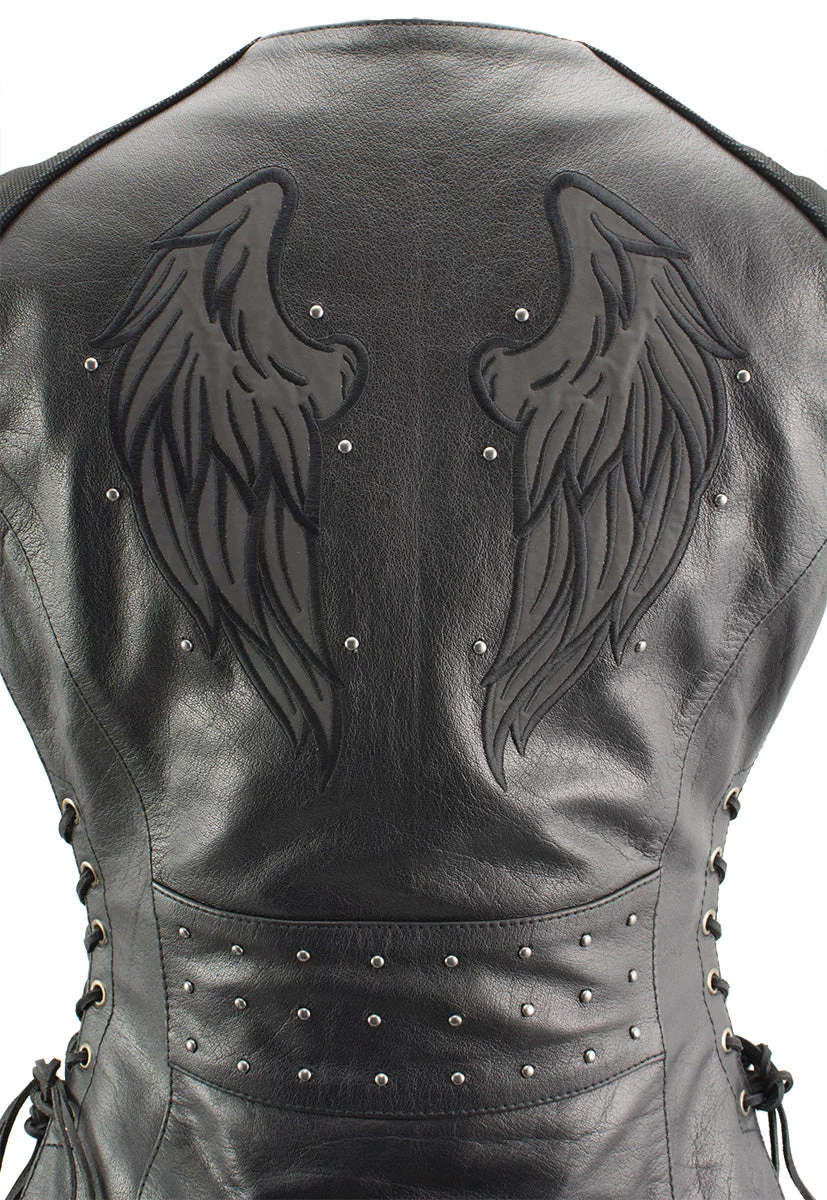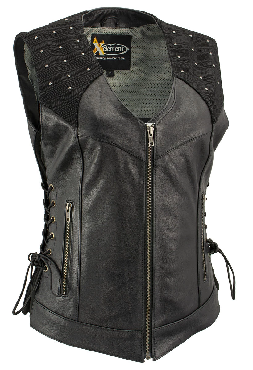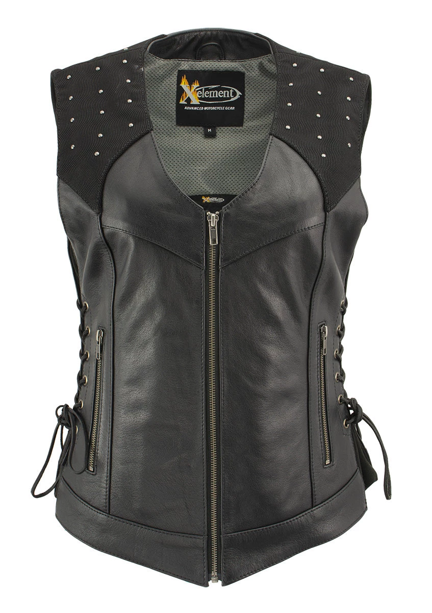 Xelement XS24001 Ladies ‘Winged’ Black Studded Leather Vest with Side Laces and Reflective Wings
