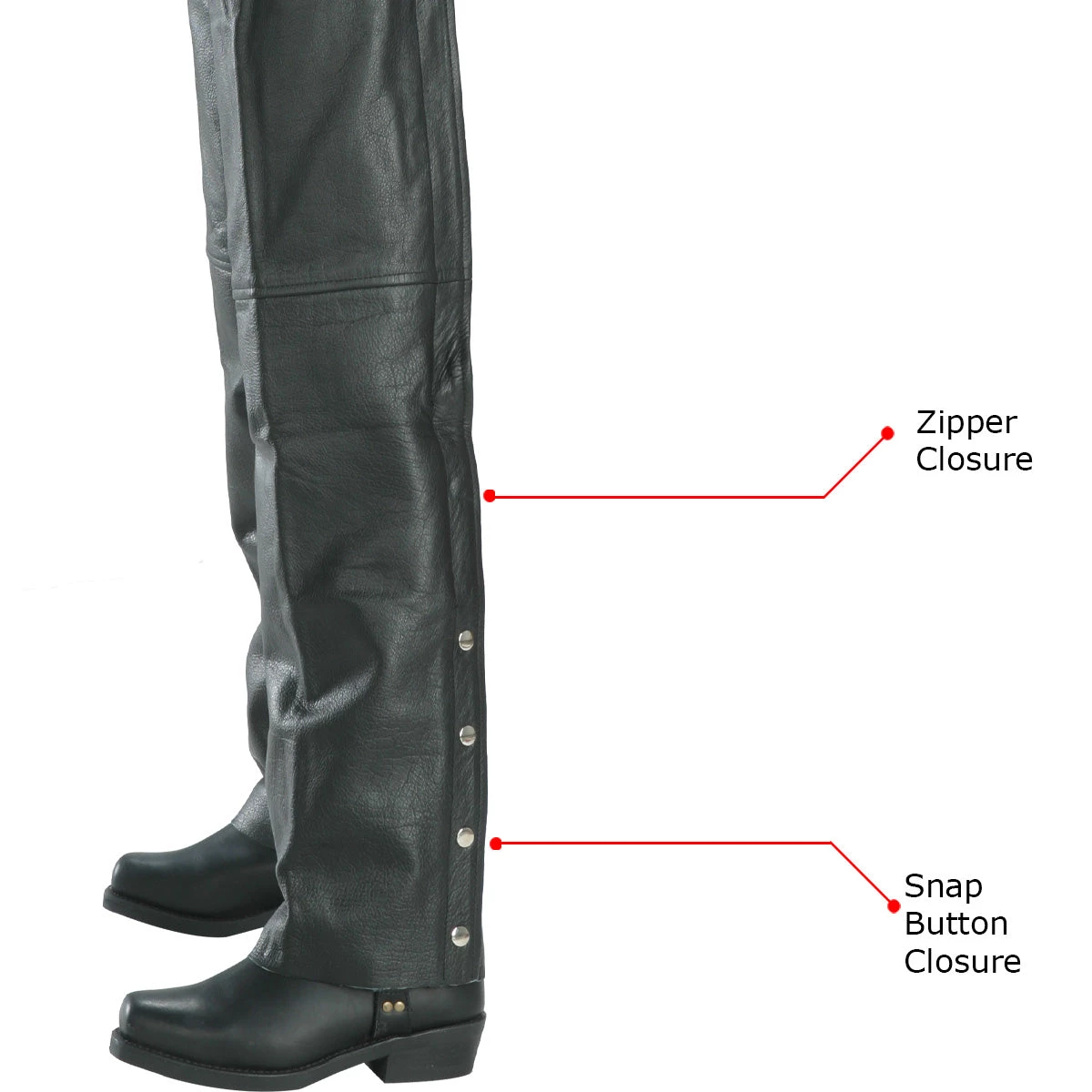 The Xelement 7553 Women’s Black ‘Advanced Dual Comfort’ Leather Chaps. These Chaps Are Made of Premium High-Grade Cowhide Leather and Feature A New Design Comfort System by Xelement. The Inner Front Thighs of The Chaps Have Elastic and Zipper Closures on The Back of The Thighs. Zipper Leg Closures with Silver Snap Buttons on The Bottom, Fully Lined, One Small Pocket, Belted Waist Closure, Waist Extender for Additional Waist Room And Strong Silver Hardware For Long Lasting Durable Wear. The Design of These Chaps Gives You the Extra Comfort and Room Need for The Long Haul. Act Now Buy A Pair and Save Big, While Supplies Last. This Item Is Only Available Here At Leatherup, The Webs #1 Online Leather Store.