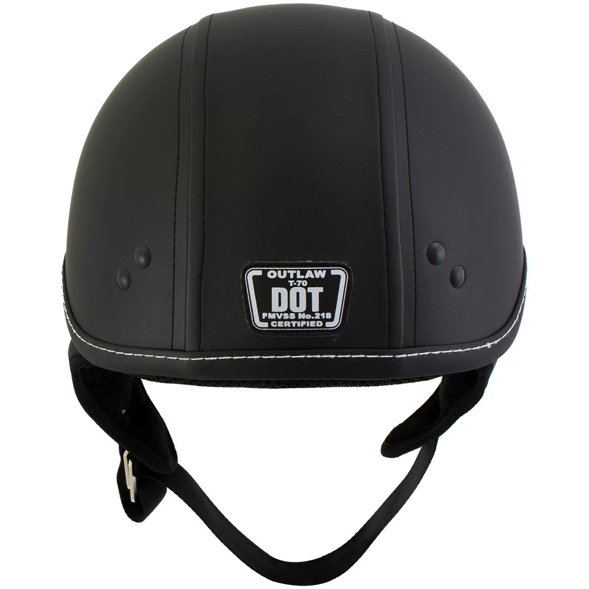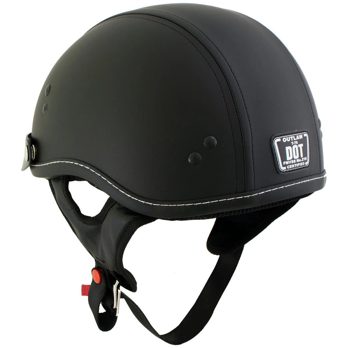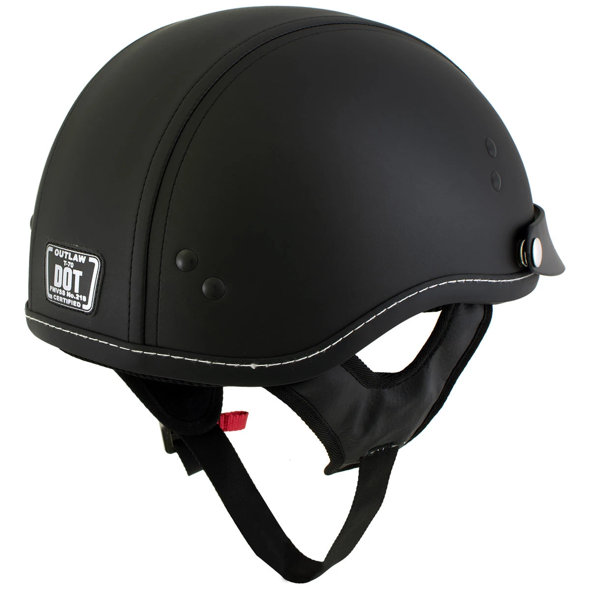 The Dark Rider is a classic cruiser half helmet with a Thermo-Polymer Alloy Shel , removable 3-snap visor, comfortable interior padding and nylex comfort liner and simple, clean design. The durable, black synthetic leather that covers the helmet is easy to clean and gives this helmet that authentic biker look. This is a lightweight Helmet around 2lbs (32 ounces). Outlaw helmets are made to enhance the riding experience and maximize safety and comfort. Meets or exceeds DOT certification.
