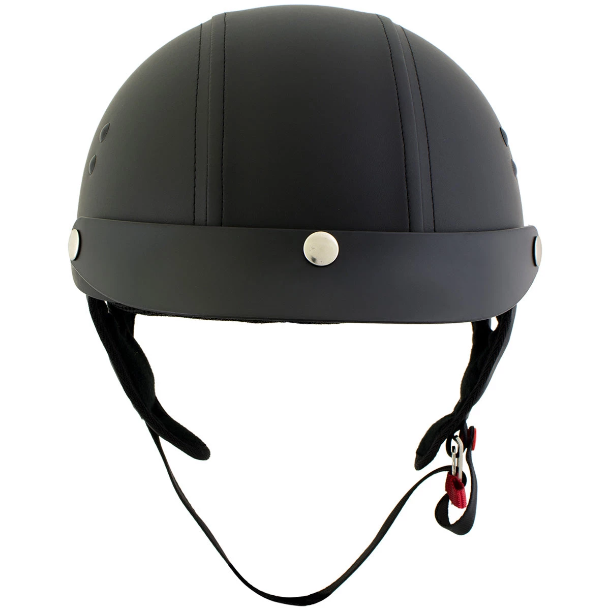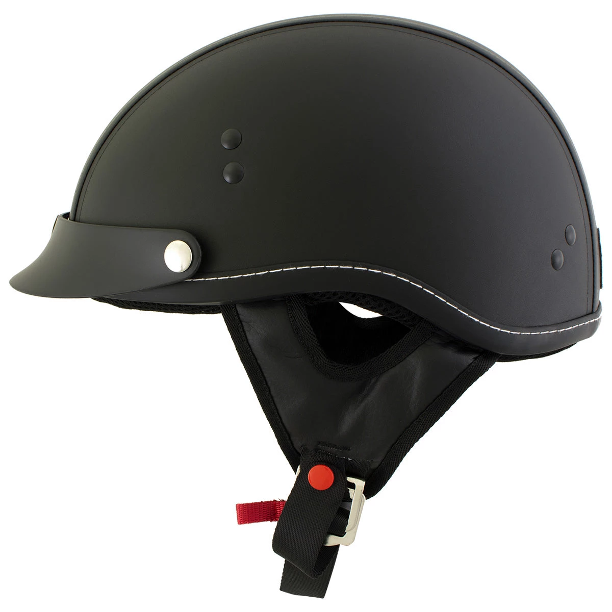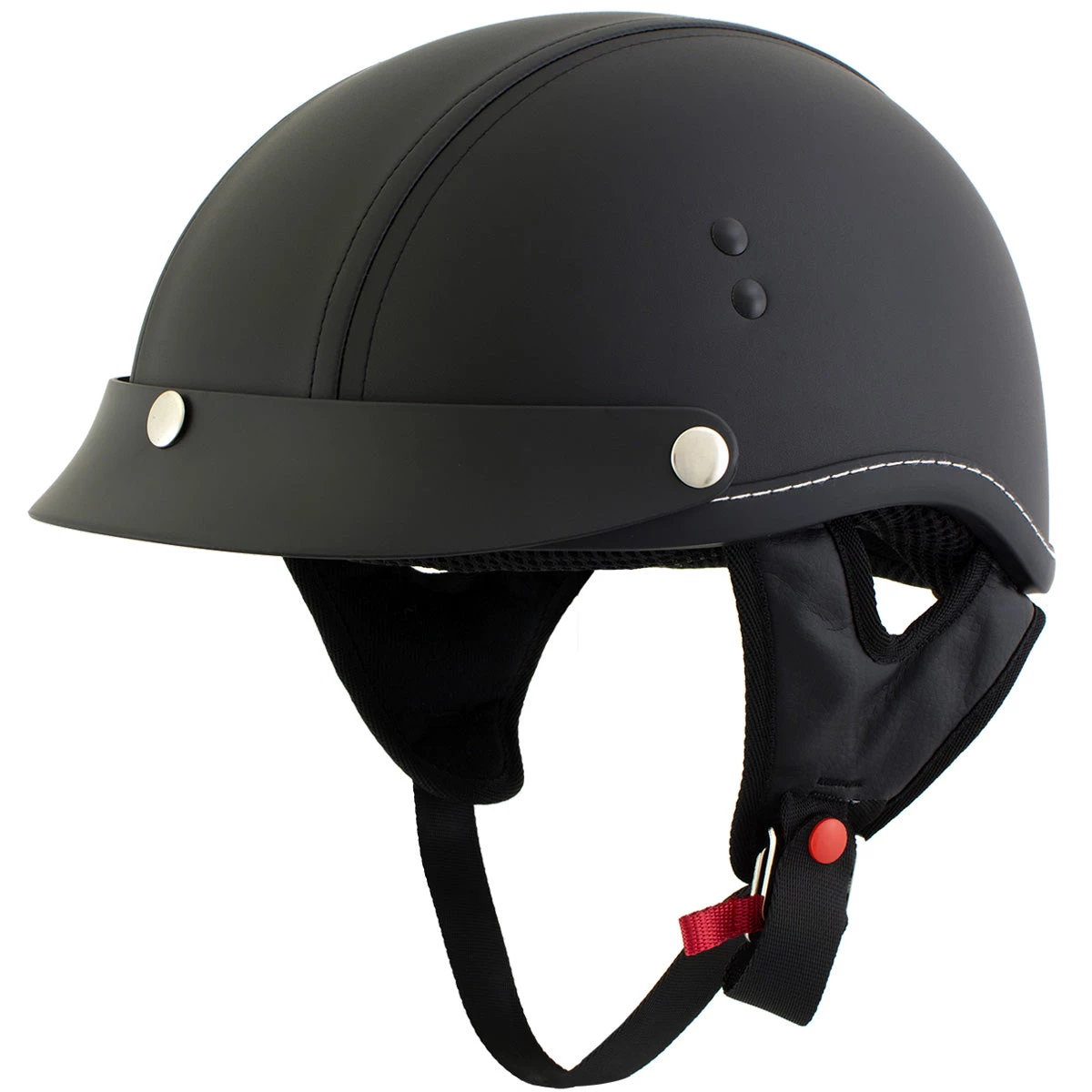 The Dark Rider is a classic cruiser half helmet with a Thermo-Polymer Alloy Shel , removable 3-snap visor, comfortable interior padding and nylex comfort liner and simple, clean design. The durable, black synthetic leather that covers the helmet is easy to clean and gives this helmet that authentic biker look. This is a lightweight Helmet around 2lbs (32 ounces). Outlaw helmets are made to enhance the riding experience and maximize safety and comfort. Meets or exceeds DOT certification.
