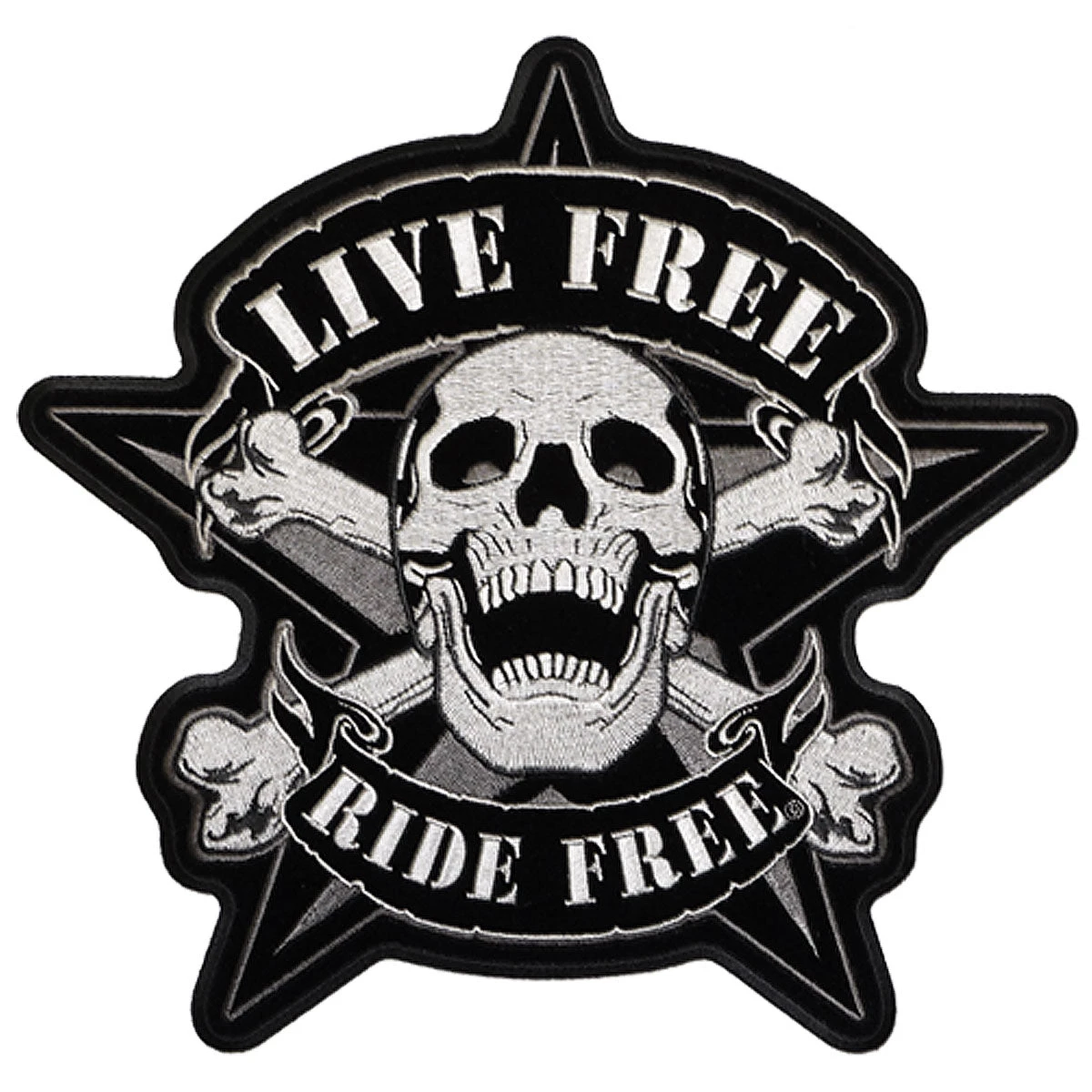 Live Free; Ride Free Embroidered Skull Patch with five pointed star in background. Heat-sealed backing for easy iron-on application.