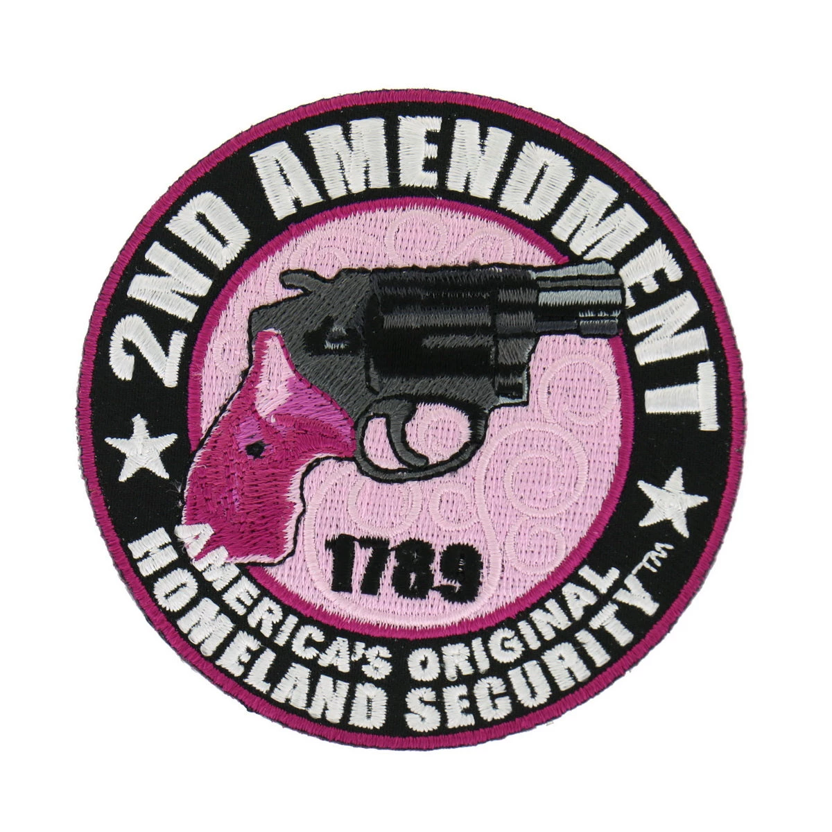Homeland Security embroidered patch with a pink handled pistol and the phrase “2nd Amendment – America’s Original Homeland Security.? This embroidered patch has a heat sealed backing for easy iron-on application.