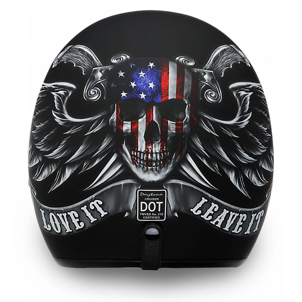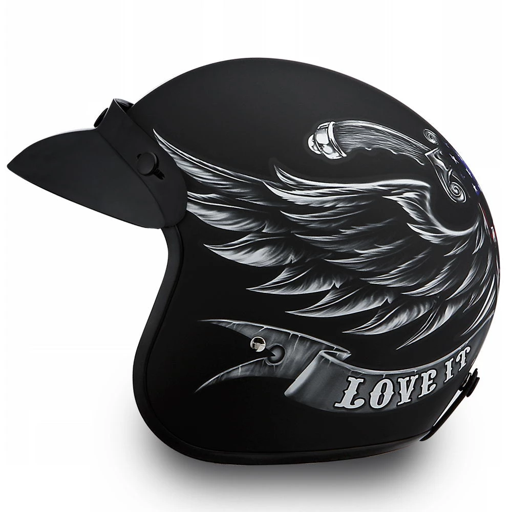 Our D.O.T. Daytona Cruiser 3/4 Shell Helmet in The ‘Love it’ Graphic, Meets and Exceeds D.O.T. FMVSS 218 Standards and Is the Smallest D.O.T. 3/4 Shell Helmet Ever Made!! With 3 Different Shell Sizes, You’re Sure to Get That Proportionate Fit!! Available Only with Removable, Snap on Gloss Black Bubble Visor. Many More Colors and Designs Available Such as Soft Touch Dull Black, Hi-Gloss Black and White; Custom Colors: Gun Metal Grey Metallic; Specialty Items: Graphics. Free Head Wrap and Cloth Draw String Bag Included. Sizes Range From XS-2XL.