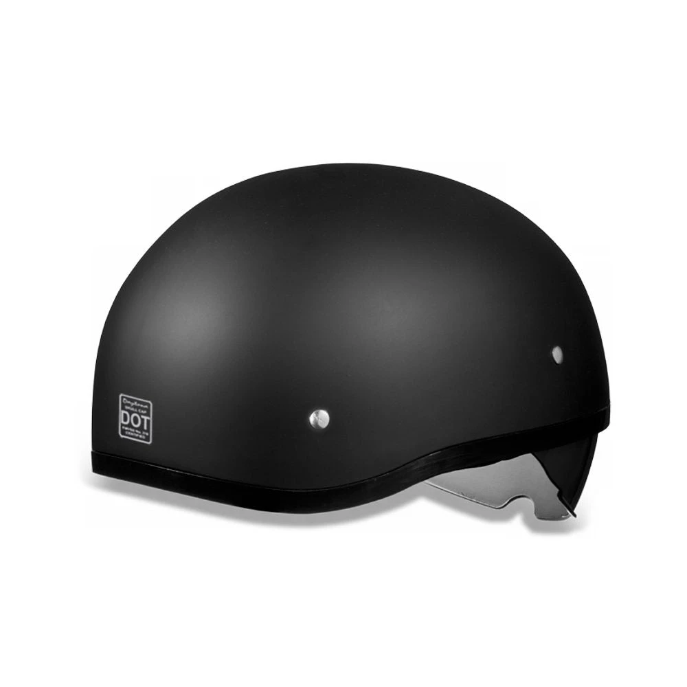 Our D.O.T. Daytona Skull Cap 1/2 Shell Helmet with Inner Retractable Smoke Shield in The Soft Touch Dull Black Finish, Meets and Exceeds D.O.T. FMVSS 218 Standards. Available Without Snaps/Visor Only. It Is Also Available in Hi-Gloss Black. Free Head Wrap and Cloth Draw String Bag Included. Sizes Range From XS-XL.