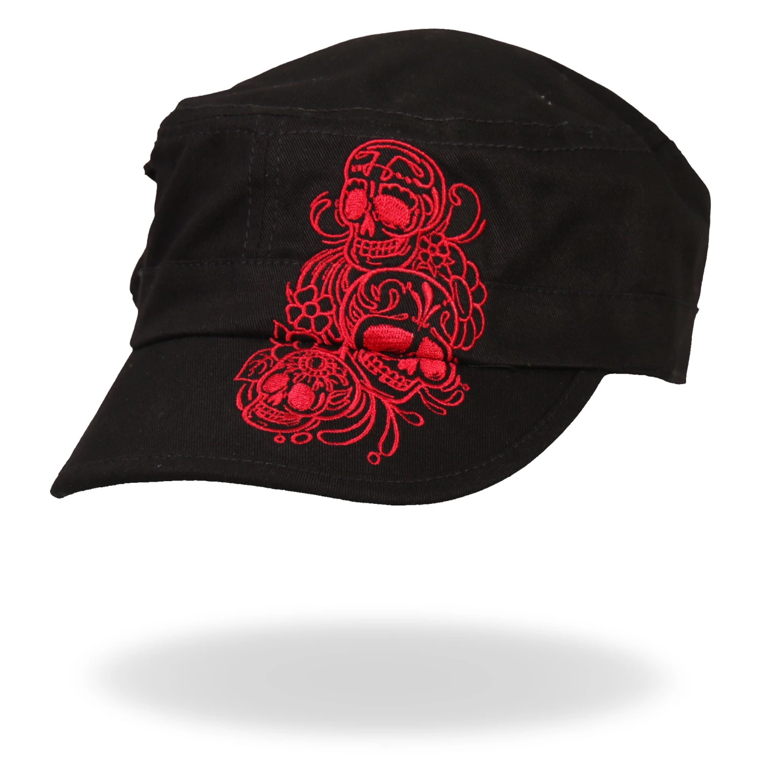 Our signature Doll Skulls Ladies Black Cadet Cap has a short curved bill with an adjustable fit. This cap features an embroidered design of three doll skulls in red as well as a cool mini pocket on the right side of the hat for added flare. This cap is perfect for the lady who wants to look good while going for a little jaunt around town. All Hot Leathers caps are durable and constructed with quality in mind.