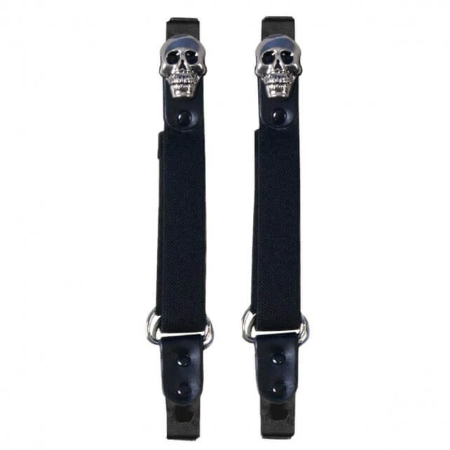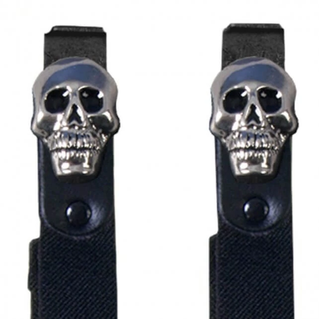 The Skulls Motorcycle Riding Pant Clips Are Manufactured in The USA And Measure 8 inches Long. These Adjustable Riding Pant Clips Are Made of Black Stretchable Bungee Material and Silver Heavy-Duty Clips with Skulls Designs. Use These Clips to Keep Your Pant Legs Down and Prevent Wind and Debris from Going Up Your Legs While Your Ride!