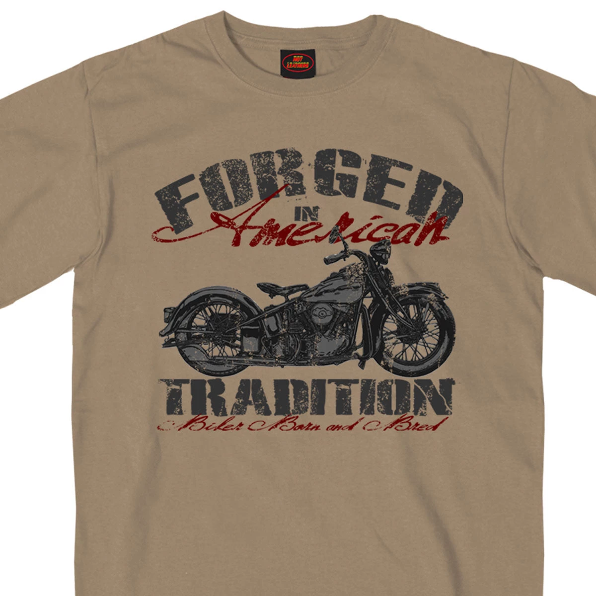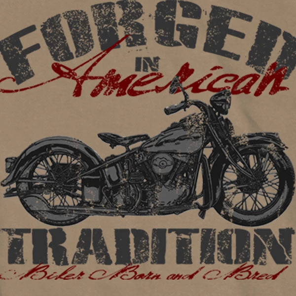 The Forged in American Tradition T-Shirt comes in the color Khaki. Presenting a screen-printed design of a classic motorcycle “Forged in American Tradition – Biker Born and Bred” adorns the front of this one of a kind t-shirt in a distressed like text. Wear it to the next big event, or wear it whenever you ride and represent the biker lifestyle in authentic biker apparel.