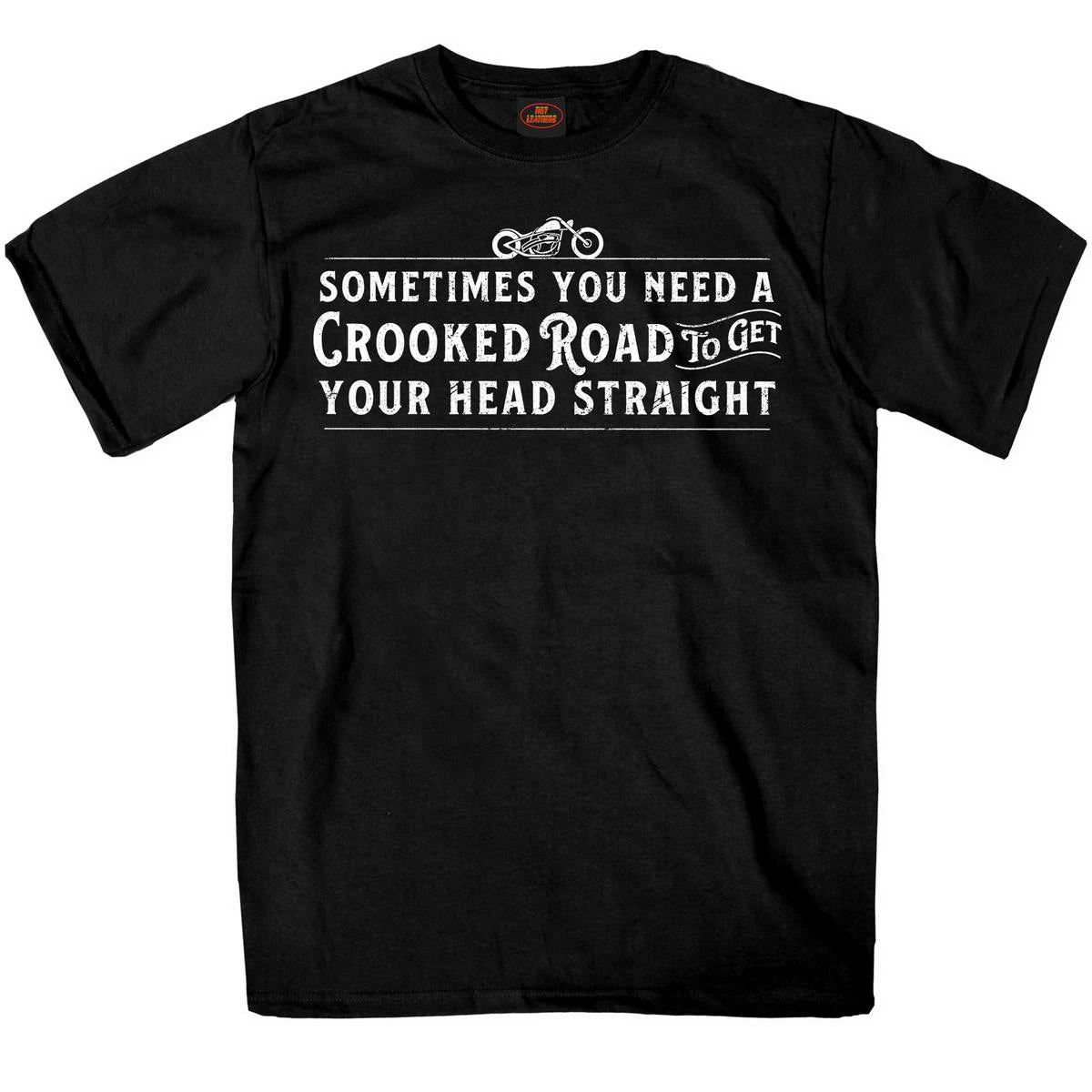 This men’s t-shirt in the color black features a classic motorcycle atop white text stating “SOMETIMES YOU NEED A CROOKED ROAD TO GET YOUR HEAD STRAIGHT”.