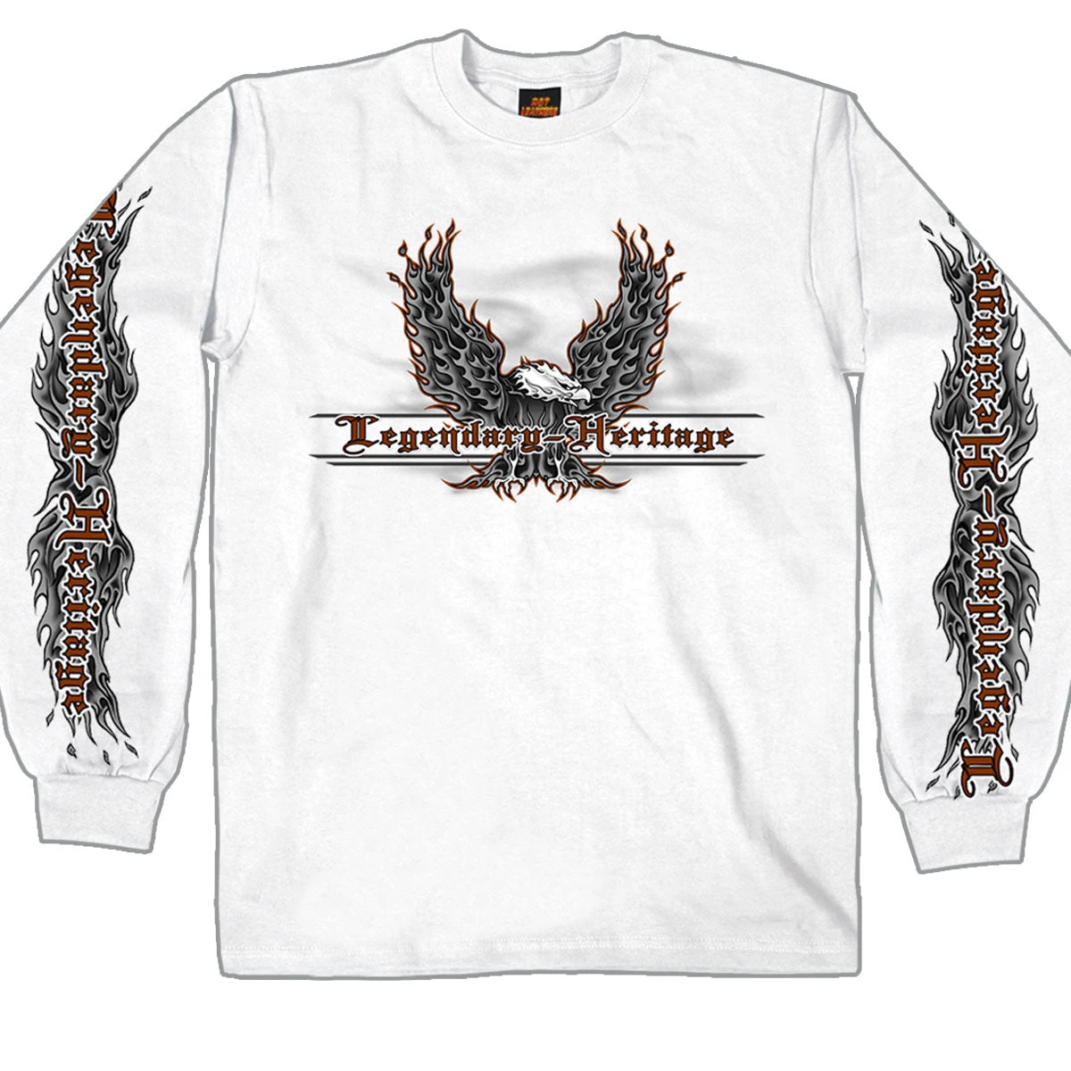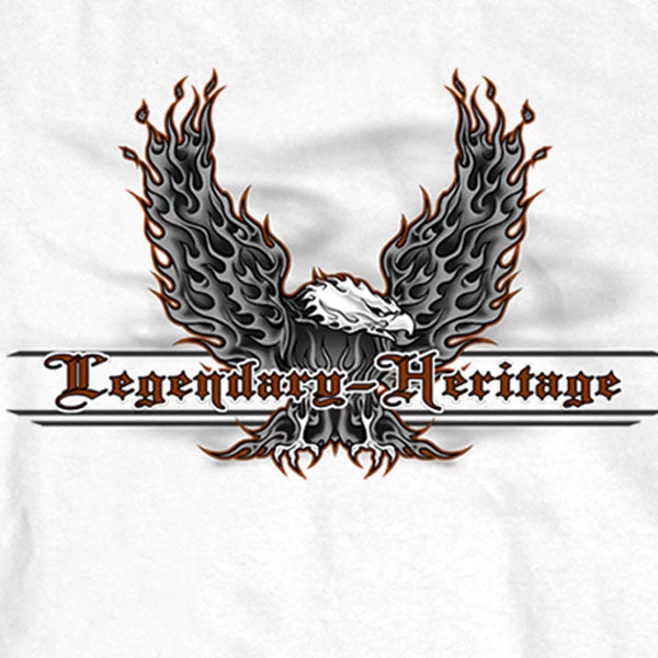 This men’s long sleeved shirt in the color White features the text “Legendary Heritage” with an upwing eagle on the front and “Legendary Heritage” inside of tribal flame wings on the sleeves.