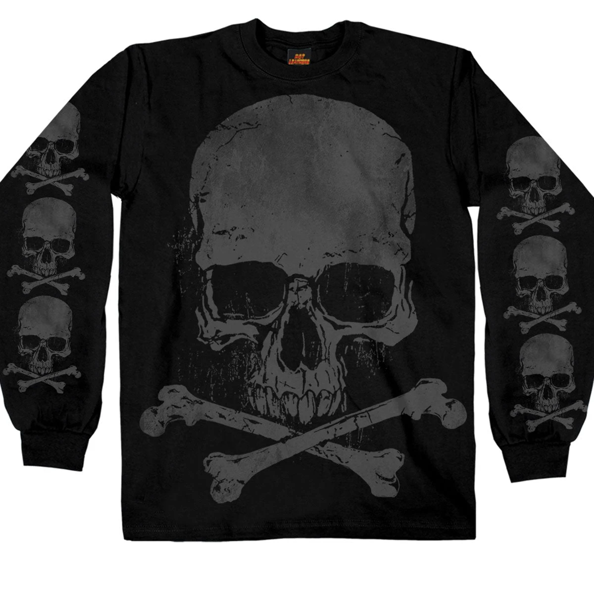 This men’s long sleeved shirt in the color Black features a Jumbo Print Skull and Cross Bones along with large screen printed images of a skull and crossbones going down both sleeves.Features