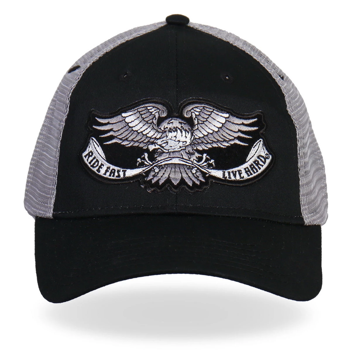 The Front Of This Hat Is Black With An Embroidered Eagle Clutching A Banner That Reads “RIDE FAST, LIVE HARD” And The Mesh Back Is A Shade Of Gray.