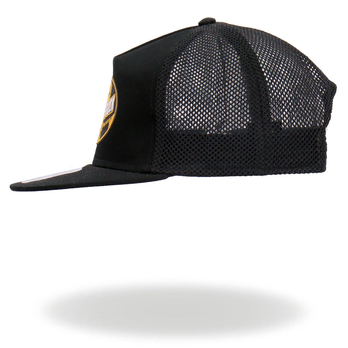 Hot Leathers Snap Back Hat. We Use Otto Brand for Our Hat Collection. This Is the Best Snap Back Flat Brim Hat in The Industry. It’s A Cotton/Polyester Blend Helps the Hat Hold Its Shape for Long Time Use. It Is a Mesh Style Back Hat with A Plastic Adjustable Tab and Features a Great Hot Leathers Art Patch.