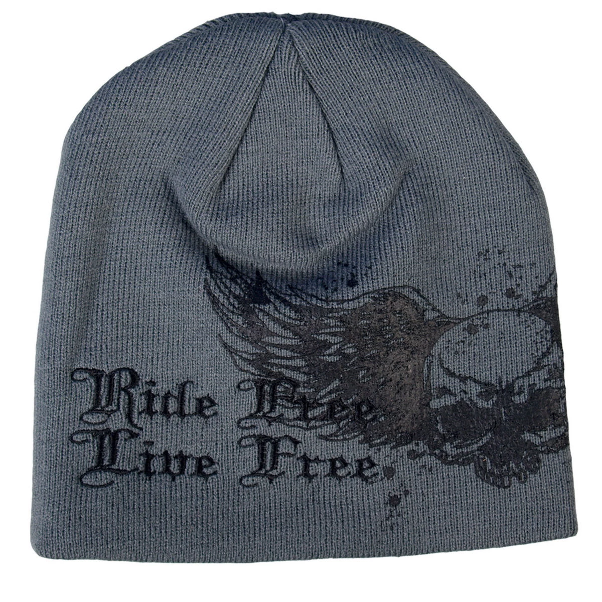 Keep your head warm during cold weather riding with the Skull with Wings Grey Knit Cap! This one size fits all, grey knit cap features an original screen printed and embroidered design of a winged skull and the words “Ride Free, Live Free” in black.