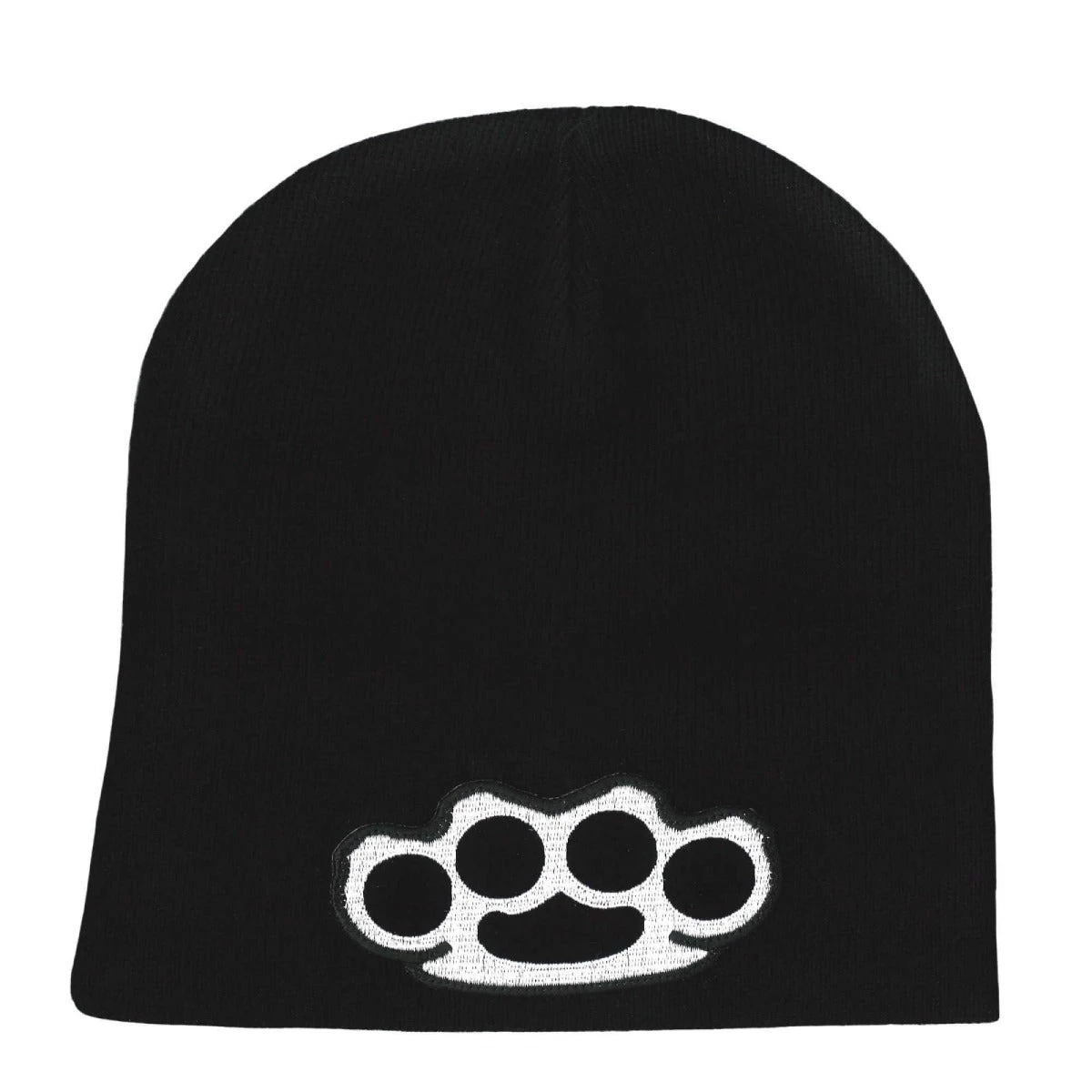 This Hot LeathersÂŽ Knit Hat has an embroidered patch of a set of white brass knuckles on front.