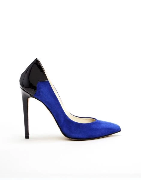 Regin Attracts the Eye with An Elegant Spectator Back Detail. In Striking Cobalt Blue Kid Suede Featuring A Black Patent Back Quarter and Heel. This Striking Pump Is A Wardrobe Essential.