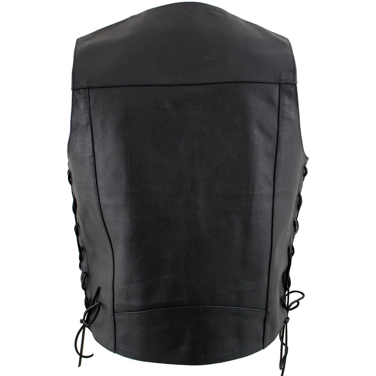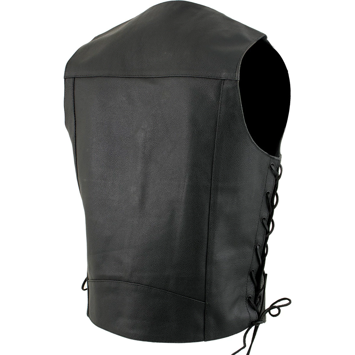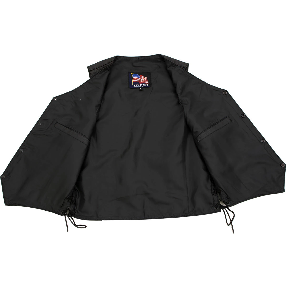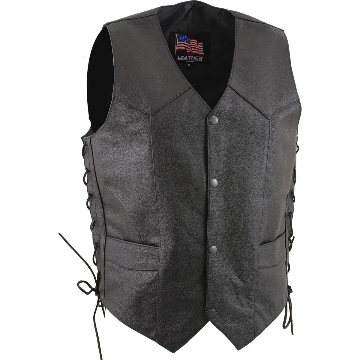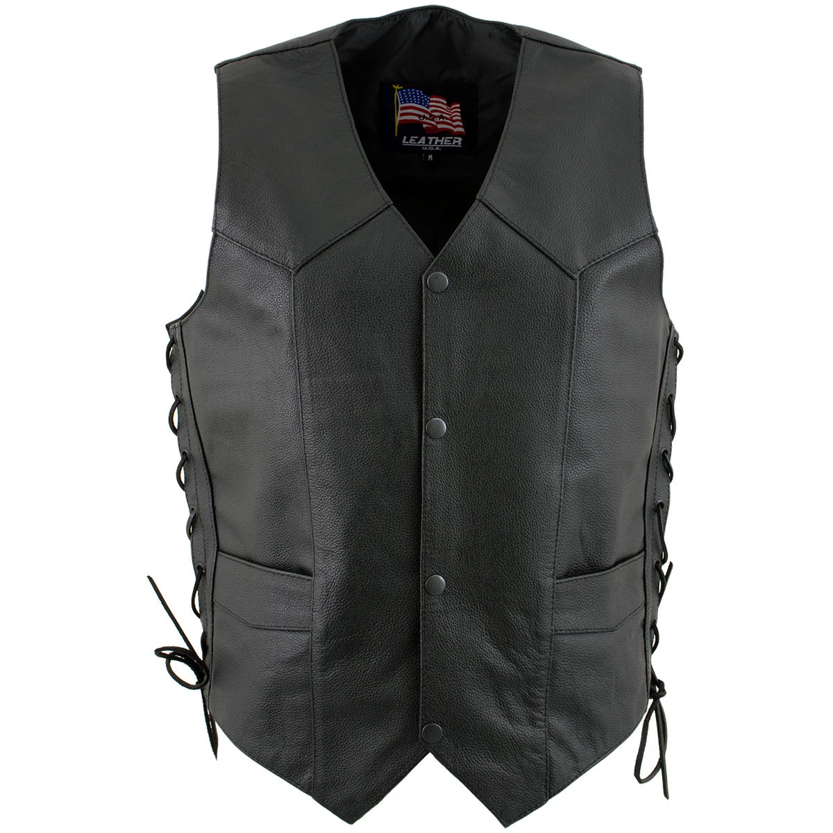 The USA Leather ‘Laced’ 1202 Leather Men’s 4 Button Side Lace Vest Is a Classic Style Vest That Features a Front 4 Snap Button Closure, Two Front Hand Pockets, Full Polyester Lined Interior And Adjustable Side Laces.