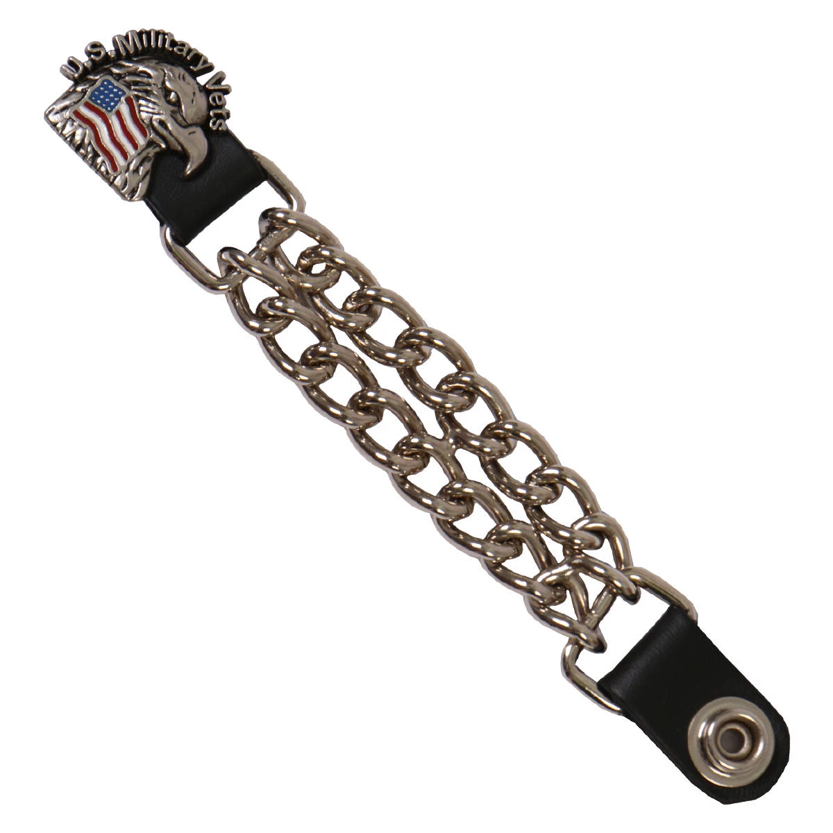 An American made double chain vest extender with a US Military medallion. Great for any vest, this extender is made of silver chain links and leather with a silver snap, designed to attach to your vest snaps and make for a better fit. Ride in biker style with the Hot Leathers US Military Vet Eagle Vest Extender. Order yours today!