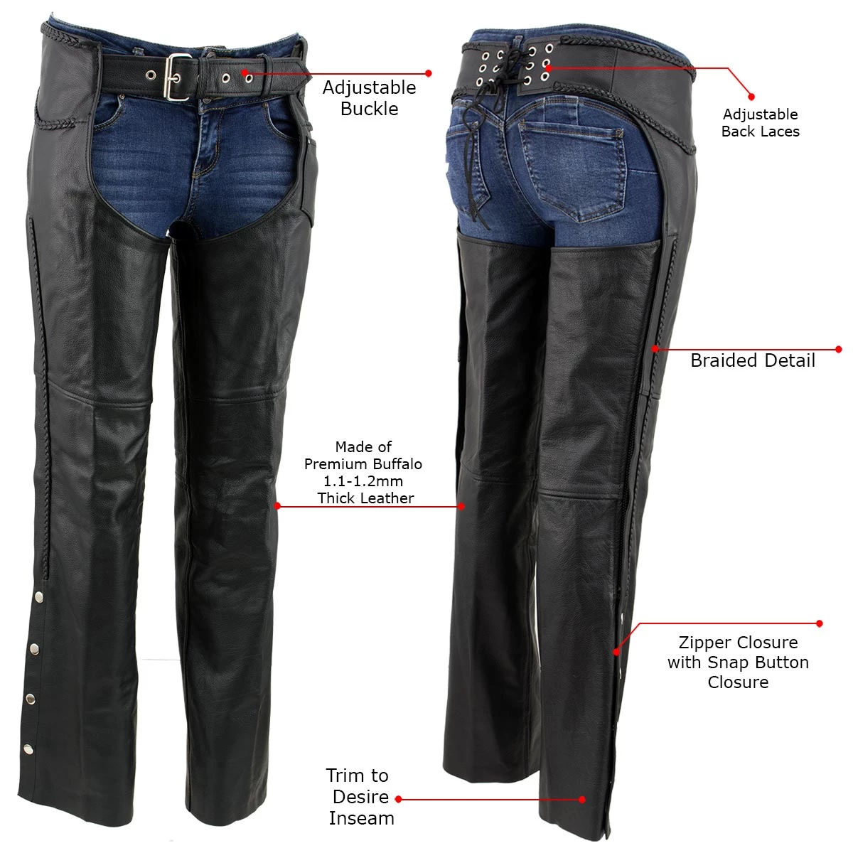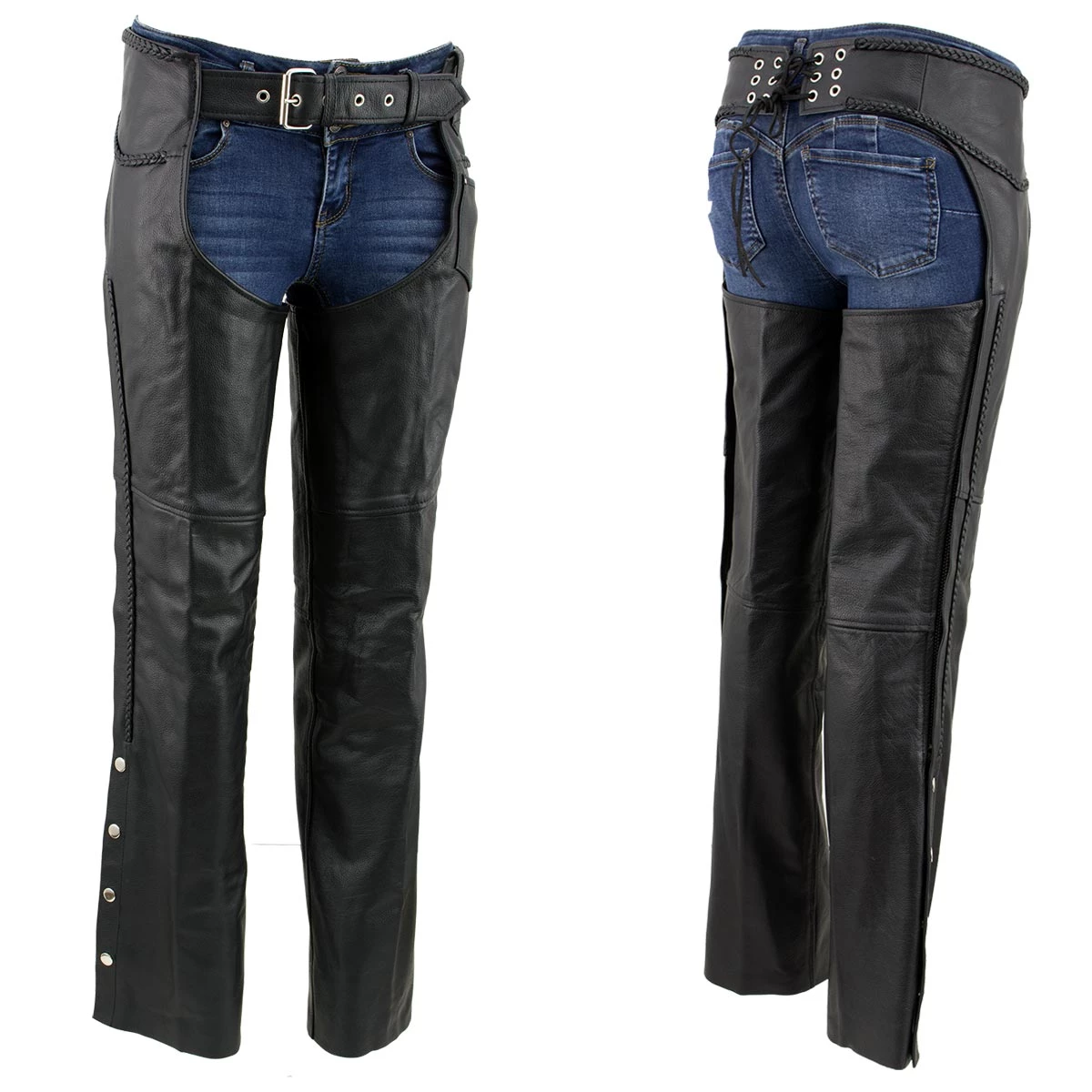 It Doesn’t Get Better Than These Braided Black Leather Chaps for Women. Built to Last These Chaps Are Made of Premium Cowhide Leather That Is Scuff Resistant. Taking These on and off Couldn’t Be Any Easier, The Chaps Feature High Quality Zipper and Snap Button Closures. Braided Leather Accents Add a Special Touch. The Chaps Are Even Fully Lined To Prevent The Leather From Staining Your Pants Underneath.