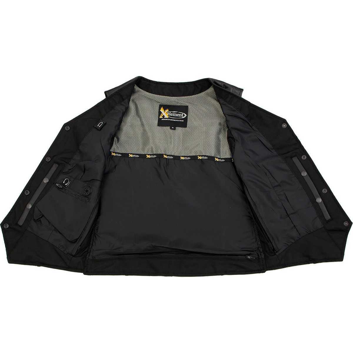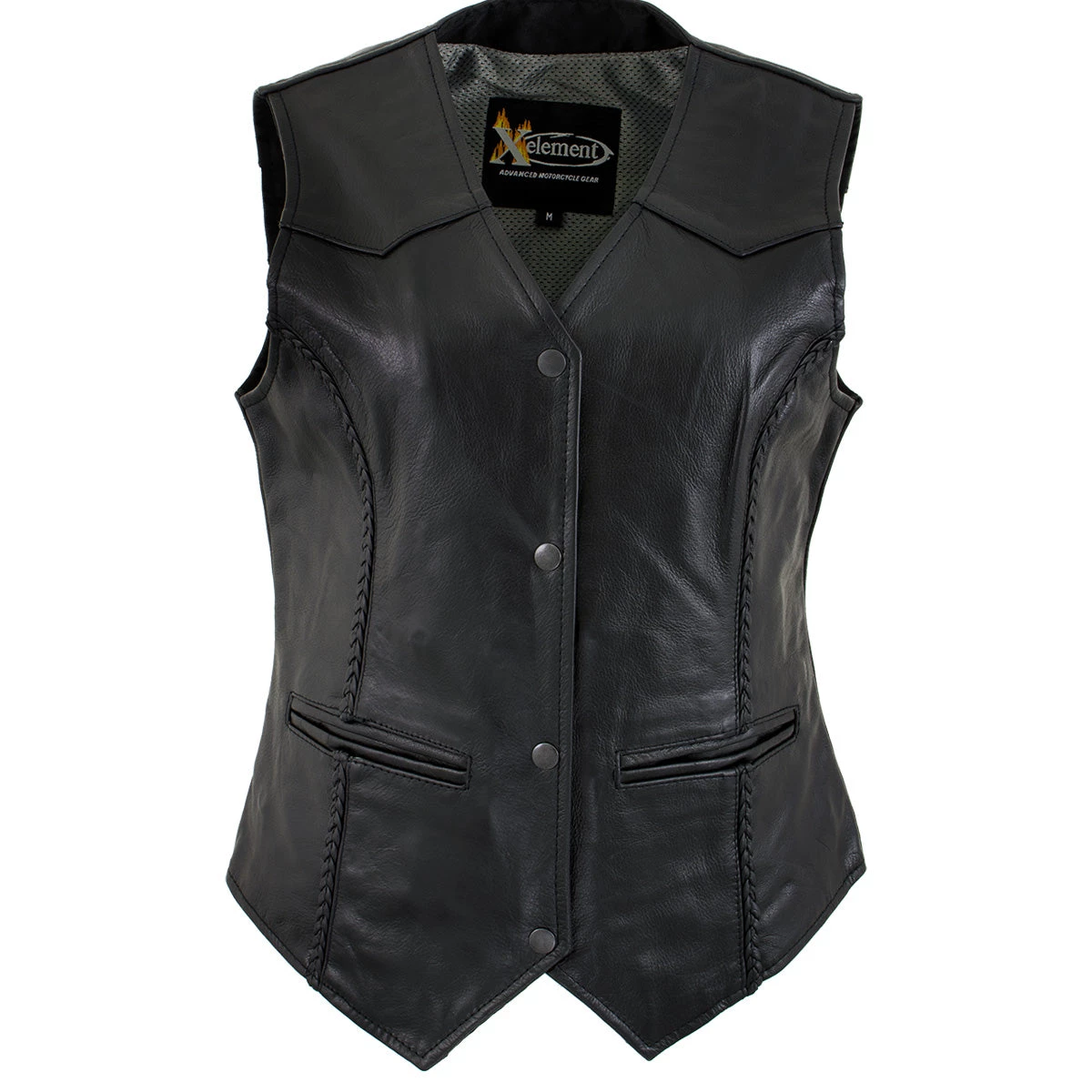 Be the Road Queen with our Xelement B206 Braided Leather Vest. The Vest Is Made of Buffalo Premium Leather with a Smooth Texture Finish and Features a 4 Button Snap Closure, 2 Side Slit Pockets, Dual Gun Pockets, Patch Zipper Technology, Nylon and Mesh Liner, Inside Phone / Media Pocket with Wire Feed and Braided Details. Buy with Confidence from The Webs # 1 Online Leather Store and Save. 30 Day Exchange and Low-Price Guarantee!