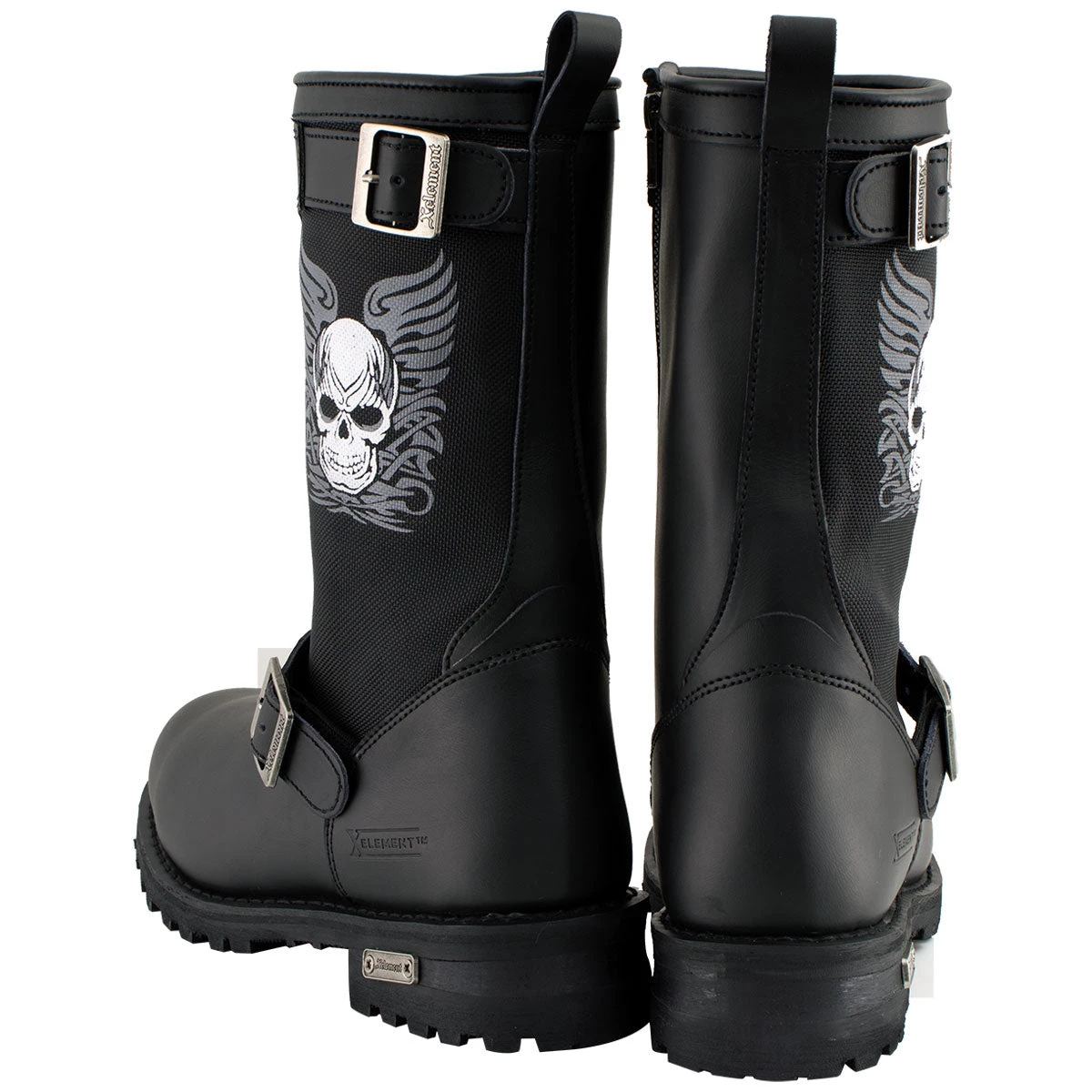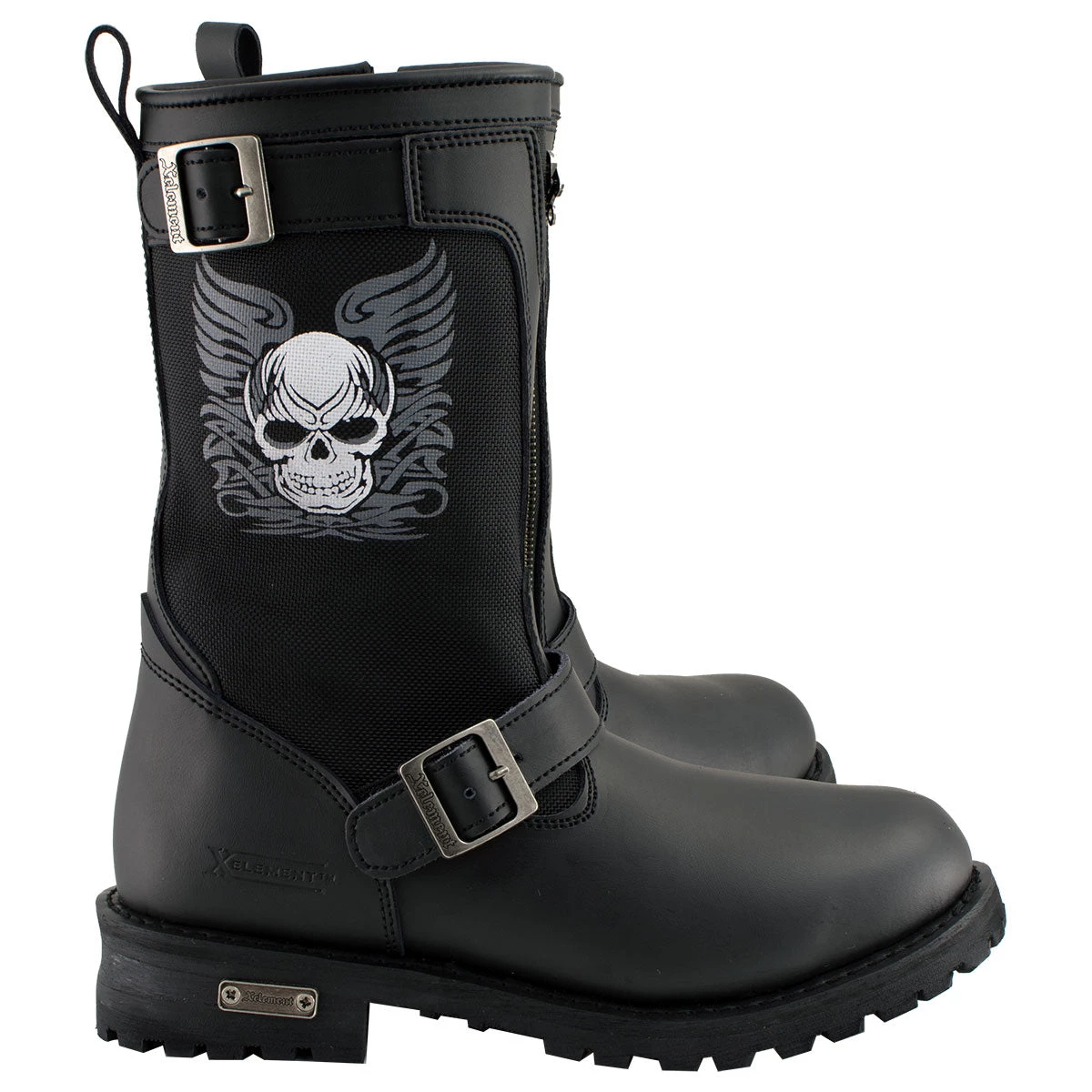 The Xelement X19405 Men’s Black Tribal Skull Boots with Poron Insoles Are Part of Xelement Performance Footwear Line. These Advanced Xelement Biker Boots Are the Most Technologically Advanced Motorcycle Boots Emphasizing Durability, Long Term Wear and Protection. Features Top Quality Full Grain Leather, YKK Zipper, Oil Resistant Heavy Duty Traction Sole, And Poron Cushioning for Extra Comfort. Features Goodyear Welt Construction, Which Stitches the Leather to The Non-Marking Rubber Out Soles and Gives You a Secure, Flexible Fit That’s Just Right. Sold Exclusively at Leatherup, The Most Popular Online Motorcycle Store.