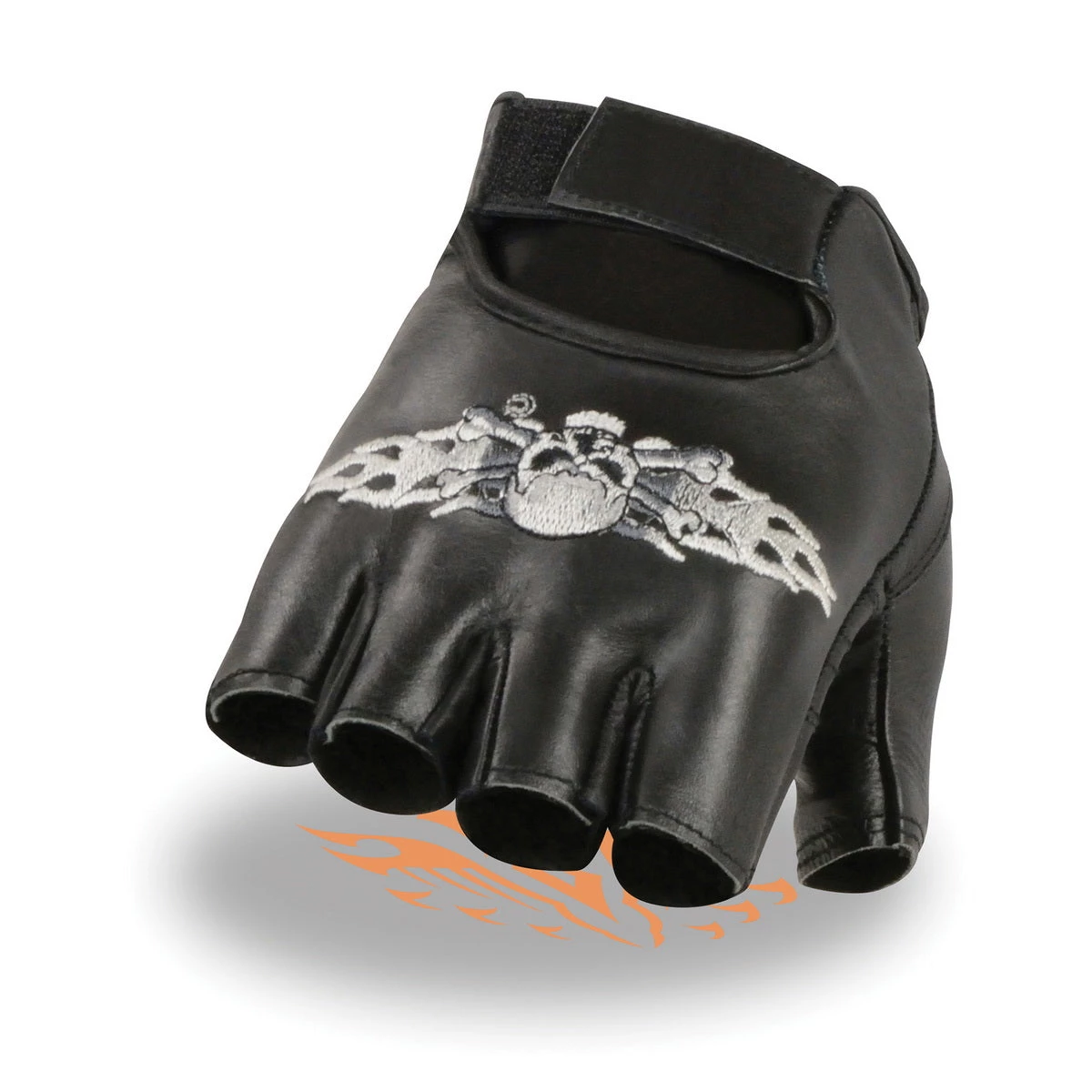 Gloves made of high-grade cowhide leather, featuring the classic fingerless design, skull with attitude embroidery graphic on the back hand. If you are planning to ride this summer, these gloves are perfect for you! Buy with confidence from the webs # 1 online leather store and save big! 30 Day Exchange & Low-Price Guarantee!