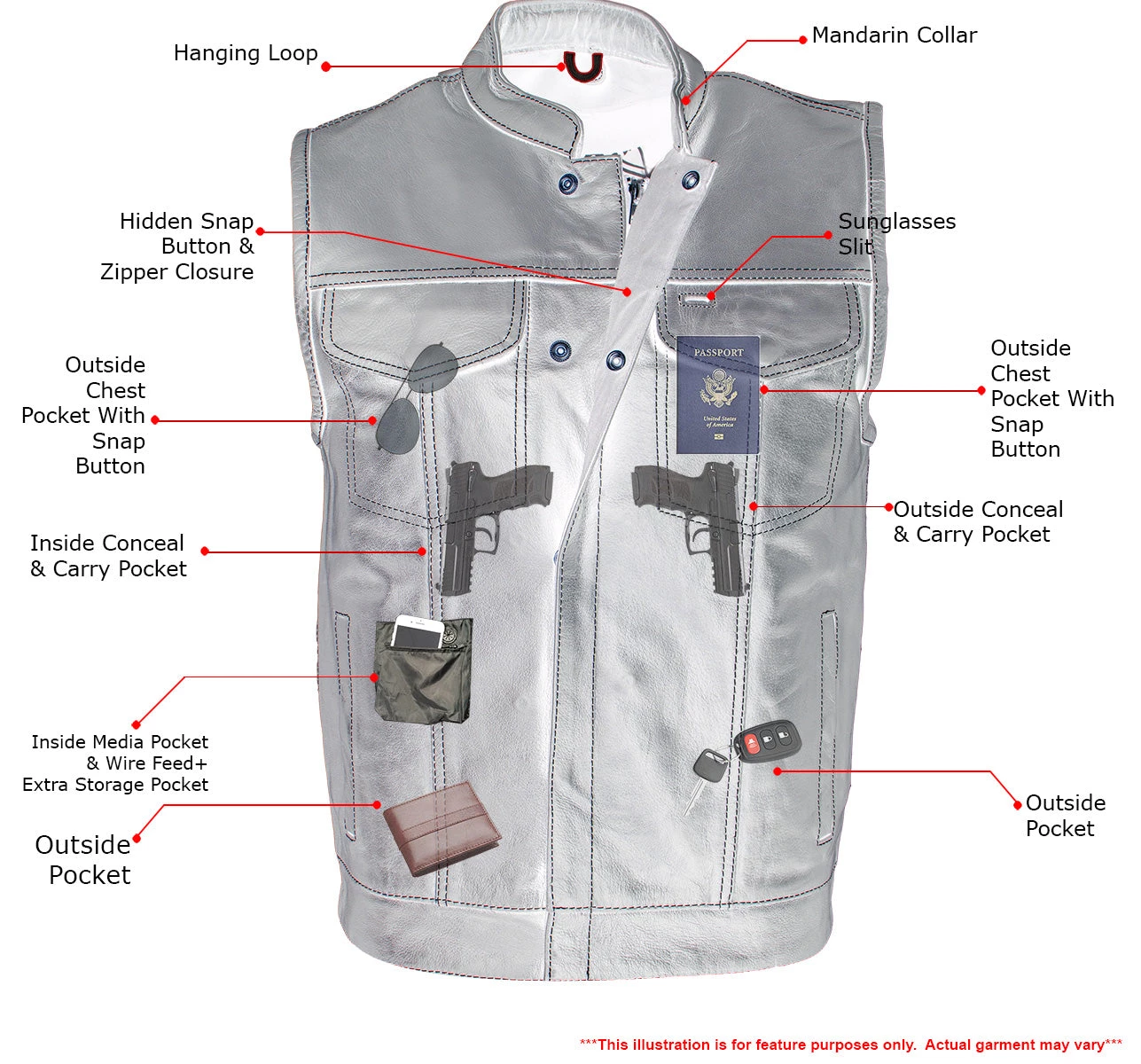 The ‘Paisley’ Leather Motorcycle Vest by Xelement is Made of Beautiful Smooth 1-2-1.3mm Thick Leather. The Inside Liner Complements the Vest with A Paisley Design, White Stitching Accented on The Color of the Leather Makes It Stand Out in A Crowd. The Stitching Has Been Strengthened Around the Edges for A Long-Lasting Fit.