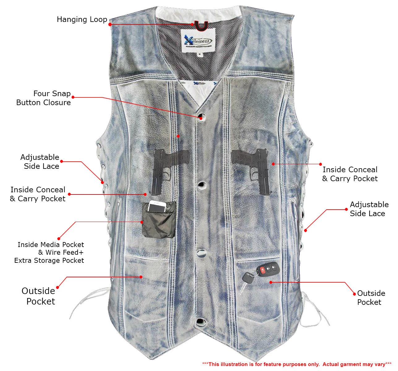 Conceal Your Piece of Steel with Our ‘Wreck’ Leather Vest By Xelement, Exclusive Design Only Found Here. Features Include Inside Dual Gun Holster Pocket, Patch Access Zipper Pockets Technology For Patches Or Embroidery (Exclusive), Perfect For Club Patches (Hard To Find), a Sleek Design with a Front Button Up Closure, Adjustable Side Laces for a Perfect Fit, and Multi-Pockets Inside and Outside of Vest. Comfort, Performance and Style by Xelement Bike Gear Always Going the Extra Distance